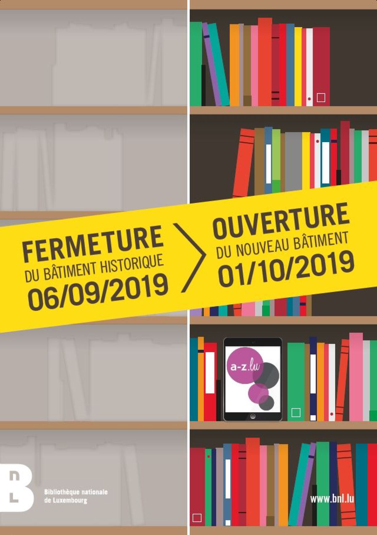 La Bibliothèque nationale de Luxembourg (BnL) informe le public que son bâtiment historique fermera définitivement ses portes le soir du vendredi 6 septembre 2019. Une phase de préparation s’avère en effet nécessaire pour garantir le bon fonctionnement de la nouvelle infrastructure dès son ouverture. La BnL accueillera le public dans ses nouveaux locaux à Kirchberg à partir du mardi 1er octobre 2019. Le prêt de documents et l’accueil des usagers au bâtiment historique Le guichet du prêt et l’accueil fonctionneront jusqu’au 6 septembre inclus. Le guichet du prêt et du renseignement seront ouverts en continu de 10 à 19 heures du mardi 3 au vendredi 6 septembre. Les ouvrages commandés seront sortis des espaces de stockage à Kirchberg et amenés au Centre-Ville. La réservation des documents s’effectue via le portail a-z.lu. Délais de réservation pour la semaine du 1 au 6 septembre: