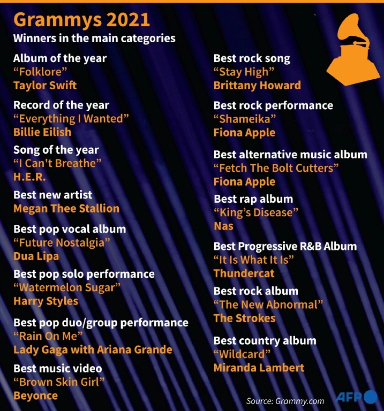 De Grammy fir de beschten Album goung un d’Taylor Swift fir “Folklore”.