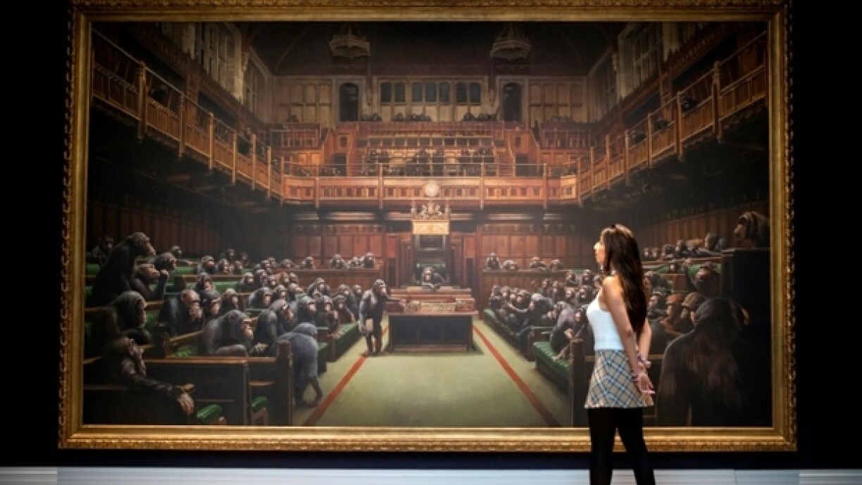 Um 2,5 Meter héijen an 4,2 Meter breede Bild sëtze Schimpansen amplaz Politiker op de grénge Bänken am briteschen House of Commons. Sotheby's hat de Wäert am Virfeld op 1,5 bis 2 Millioune Pond geschat. Déi elo erziilten Zomm ass e Rekord fir d'Wierk vum britesche Kënschtler, deem seng Identitéit onbekannt ass. Bis elo louch de Rekordpräis vun engem vu senge Wierker bei ëmgerechent 1,7 Milliounen Euro.