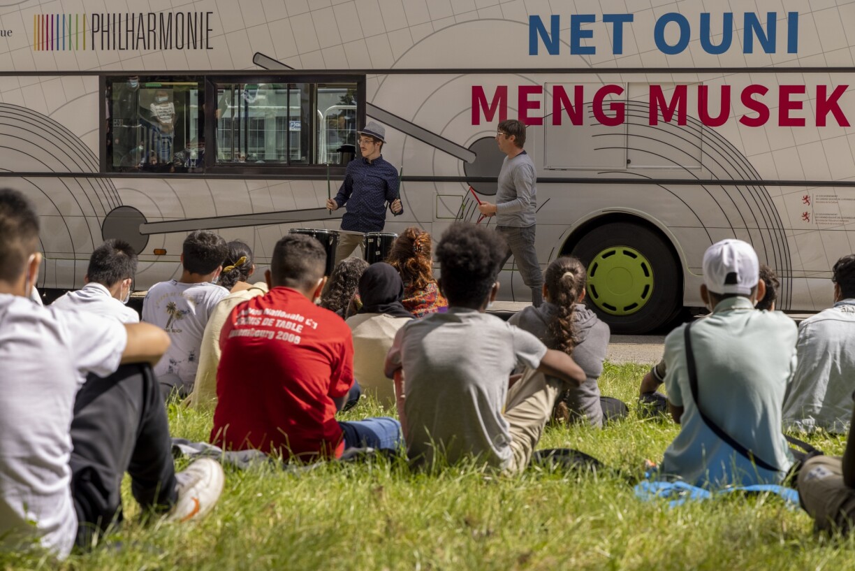 „Net ouni meng Musek“ bedeutete in diesem Jahr nicht nur, Musikinteressierte in der Philharmonie zu empfangen, sondern auch Musik hinauszutragen. Der eigens hierfür gestaltete Bus fuhr besetzt mit kleinen Ensembles durch das ganze Land und sorgte für Überraschungsmomente. Dabei machte der Bus nicht nur auf öffentlichen Plätzen Halt, sondern besuchte auch Seniorenheime und Schulen. Bei einem abwechslungsreichen Programm des Jazz Ensembles und des Brass Quintetts des OPL boten die Stippvisiten Unterhaltsames für Groß und Klein.