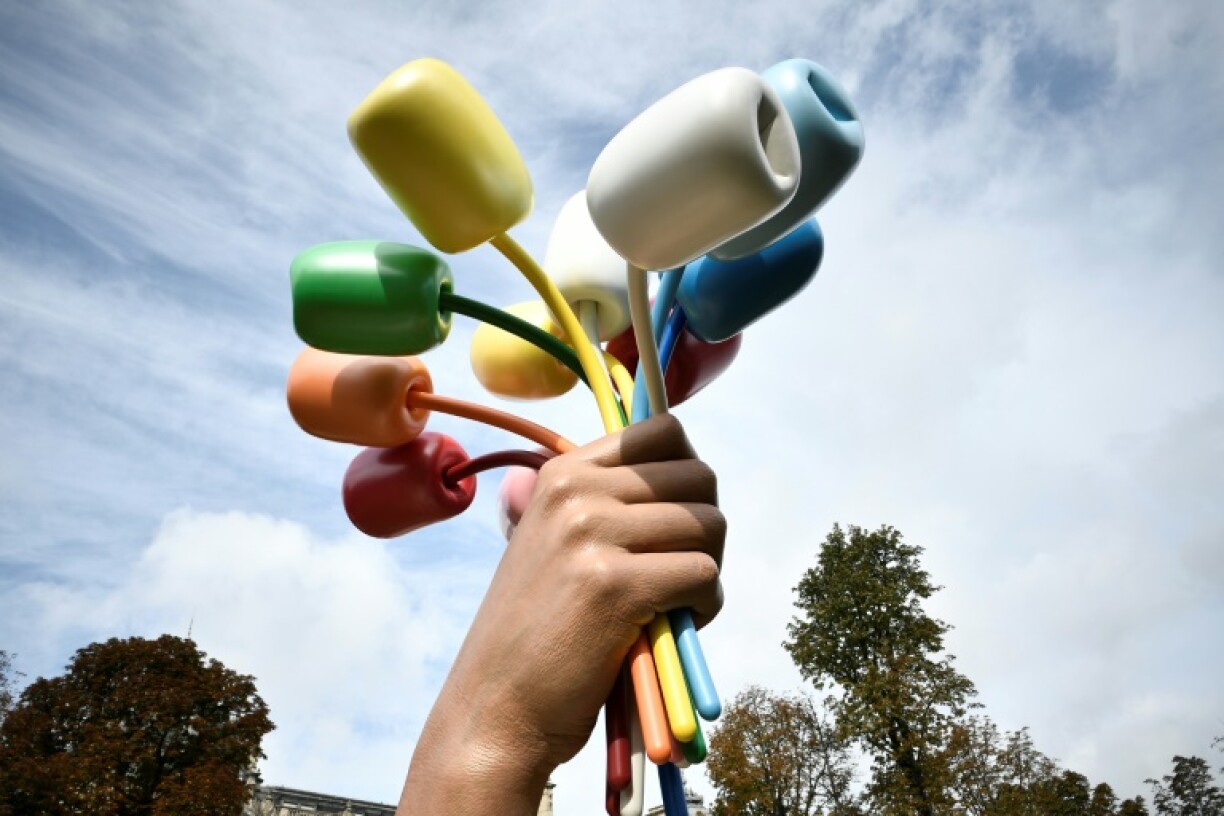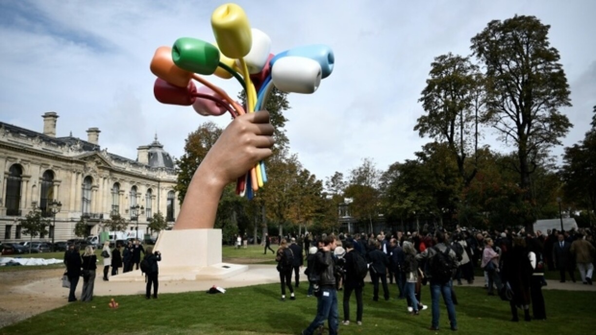 Dat 12 Meter héicht Wierk vis-a-vis vum Eiffeltuerm besteet aus enger monumentaler Hand, déi 11 faarweg Tulpen am Grapp hält.