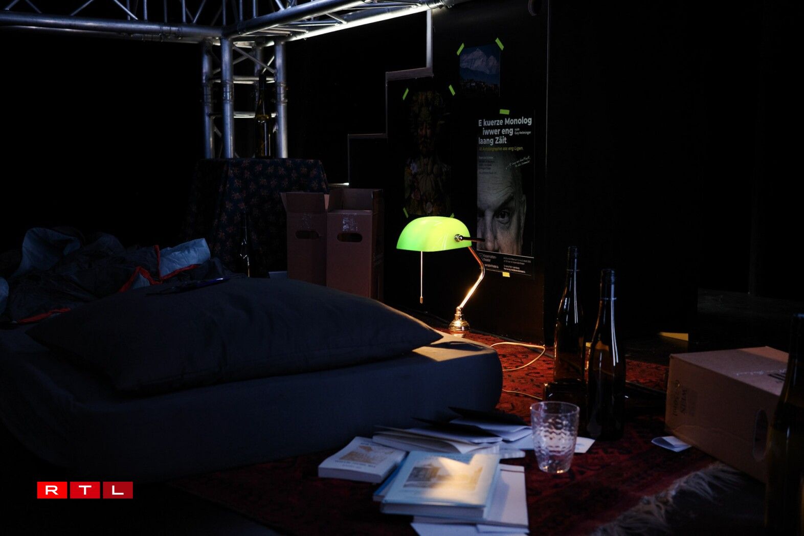 Jee nodeem, wou een als Spectateur sëtzt huet, en entweder méi Abléck an dem Guy seng Wunneng, oder a seng Gedanken an Erënnerungen. Duerch déi originell Bünenopdeelung ass et dem Liss Scholtes gelongen, tëscht der Realitéit an dem Guy senge Gedanken hin an hier ze sprangen an de Monolog duerch Persounen aus der Vergaangenheet ze beräicheren.