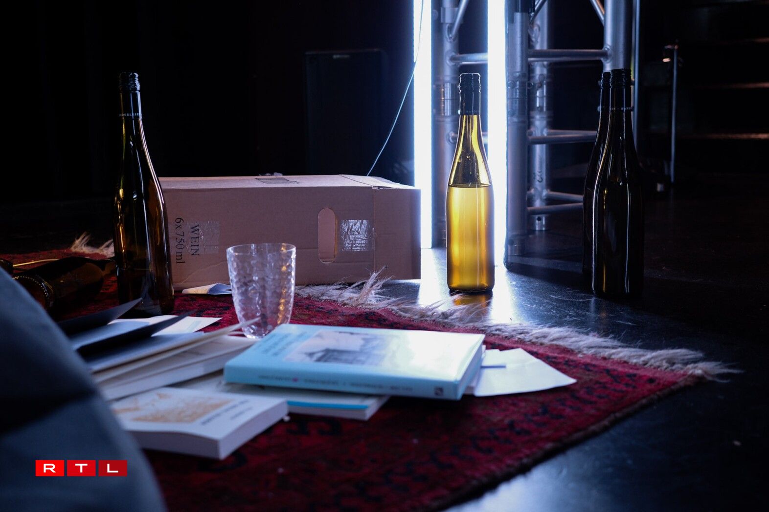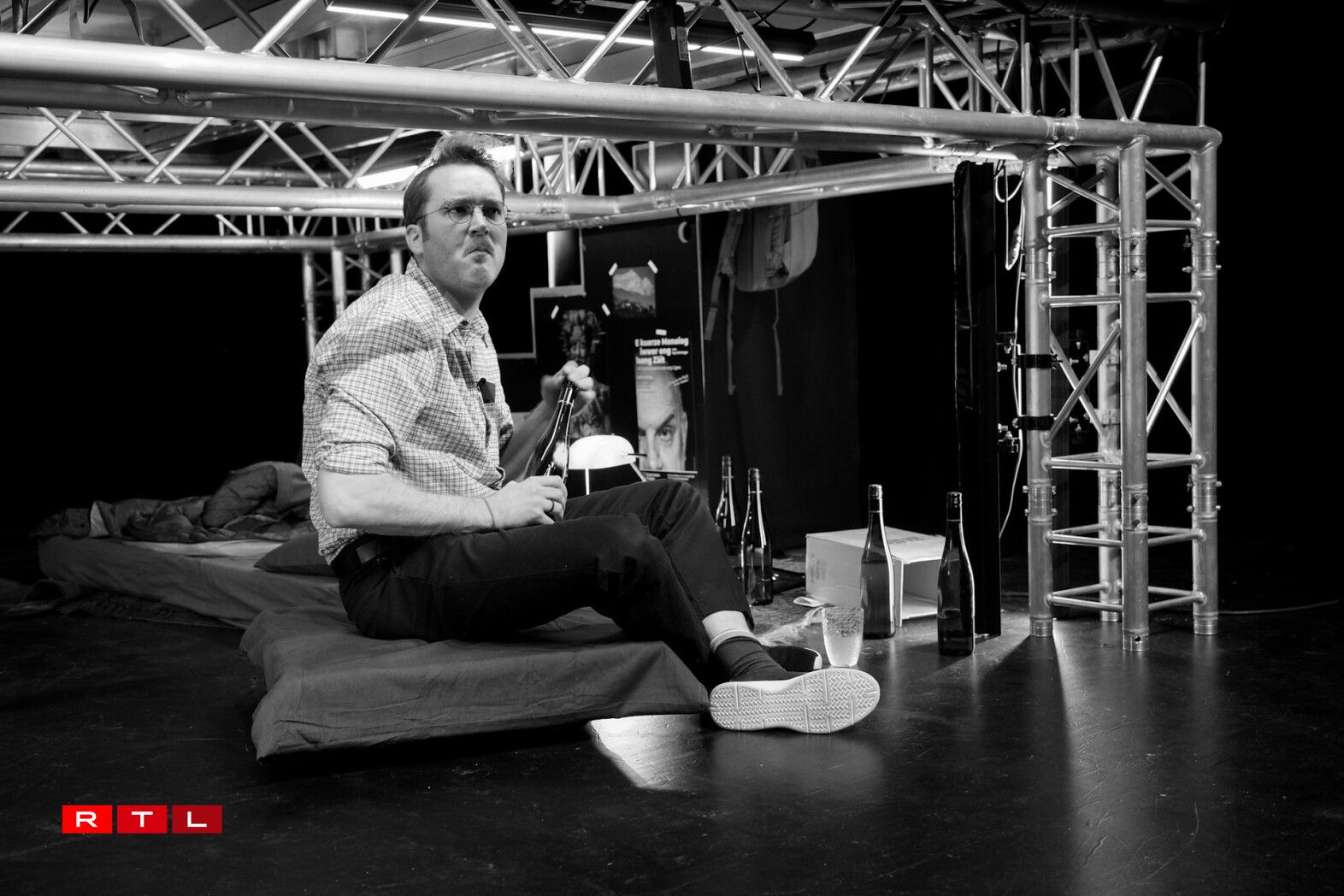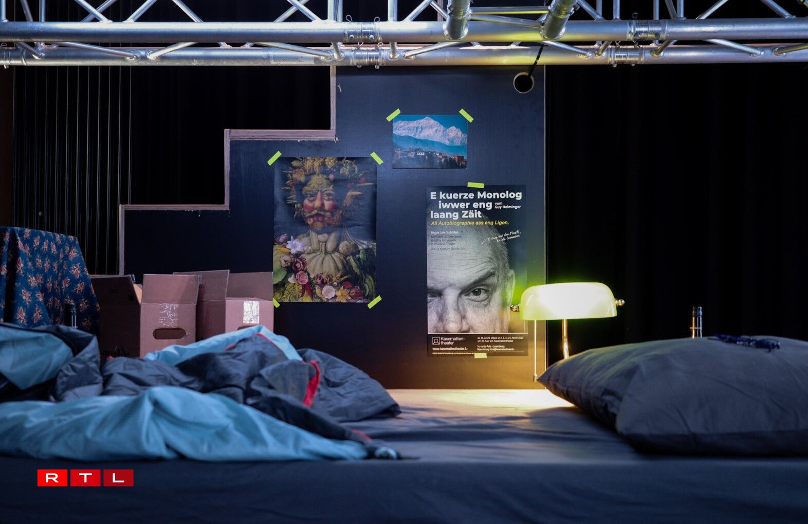 Ënnert der Bün ass dem Guy seng Wunneng, d’Realitéit. Op der Bün ginn Zeenen aus senger Gedanken oder der Vergaangenheet gewisen. Et tauchen ëmmer rëm Personnagen aus dem Guy senger Vergaangenheet op, wéi zum Beispill seng Elteren, Exfrëndinnen oder Kolleegen. D’Brigitte Urhausen an d’Jil Devresse sprangen dofir a verschidde Rollen.