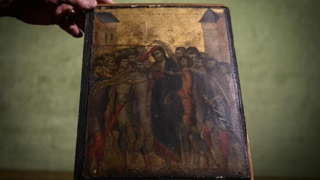 Dat klengt Wierk weist op gëllenem Ënnergrond de Christus a ronderëm hien eng Mënschemass. D'Wierker vum Cenni di Pepo (ongeféier 1240 bis 1302), wéi den Cimabue eigentlech heescht, sinn immens rar. De Moler vu Florenz gëllt als ee vun de wichtegste Personnagë vun der italienescher Vir-Renaissance.