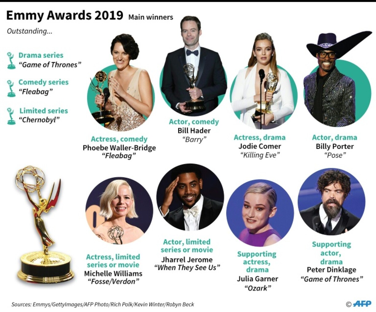 Bei de Fraen huet d'Jodie Comer fir hir Roll an der Serie "Killing Eve" gewonnen. Och fir si war et den éischten Emmy.