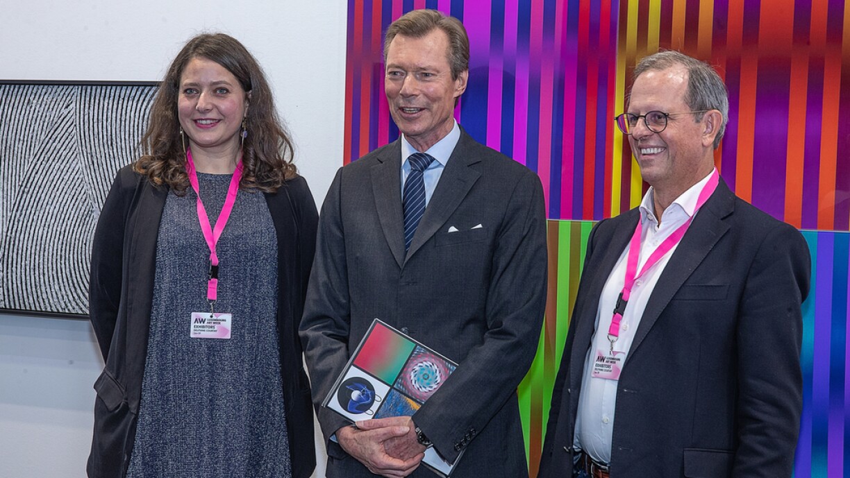Nach virun der offizieller Ouverture vun der 5. Editioun vun der Konschtfoire gouf et méi héije Besuch an der Victor Hugo Hal. De Grand-Duc, zesumme mat der Kulturministesch Sam Tanson, dem Premier Xavier Bettel mat sengem Mann hu sech d'Wierker ugekuckt an erkläre gelooss.