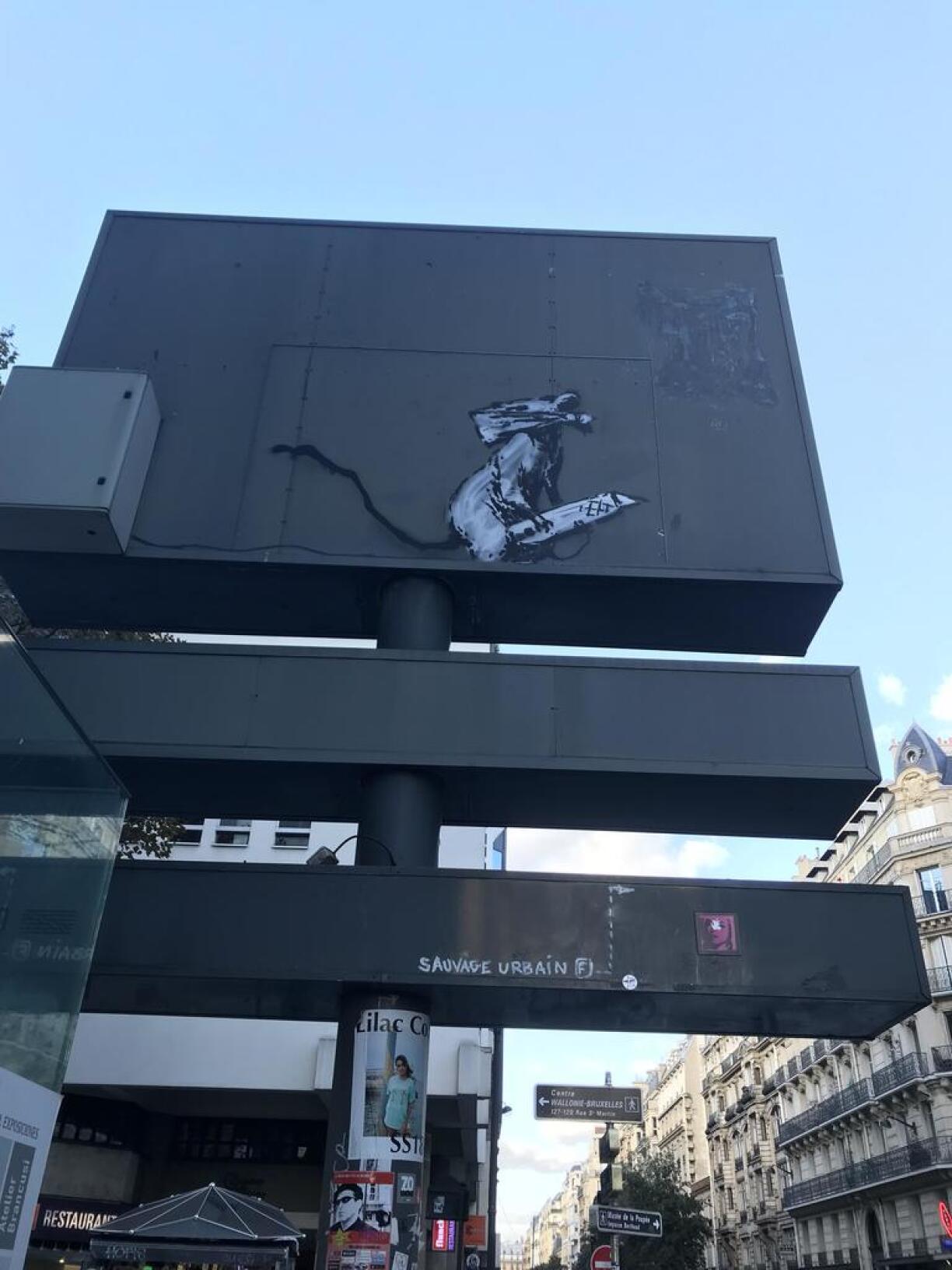 Direkt beim Parking vum Centre Pompidou zu Paräis konnten d'Passanten, wann se opgepasst hunn, nach viru kuerzem e Konschtwierk vum weltbekannte Kënschtler a Streetartist Banksy bewonneren. Hei huet de Bansky nämlech am Summer 2018 eng vu senge charakteristesche Rat op e Schëld direkt virum Parking vum Centre Pompidou gesprayt a sollt un d'Evenementer vum Mee 68' erënneren.