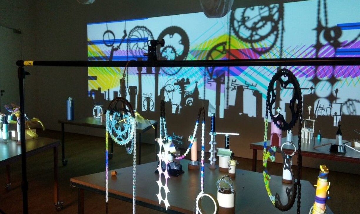 Et ass quasi eng Silhouette vun enger Stad, déi am Zesummespill vun Objeten a Projekteren entsteet. E Bild, wat sech déi ganz Zäit ännert. Duerch déi verschidden Objeten, déi dobäikommen oder ewechgeholl ginn an de faarwegen Hannergrond. D’Iddi fir dës Installatioun huet de Lëtzebuerger Kënschtler Steve Gerges ausgeschafft. Wéi hien d’Objeten gesinn huet, déi fir den Atelier zur Verfügung stinn, hätt hie séier gemierkt, dass ee mat Hëllef vu Projekteren eng Stad kéint bauen.