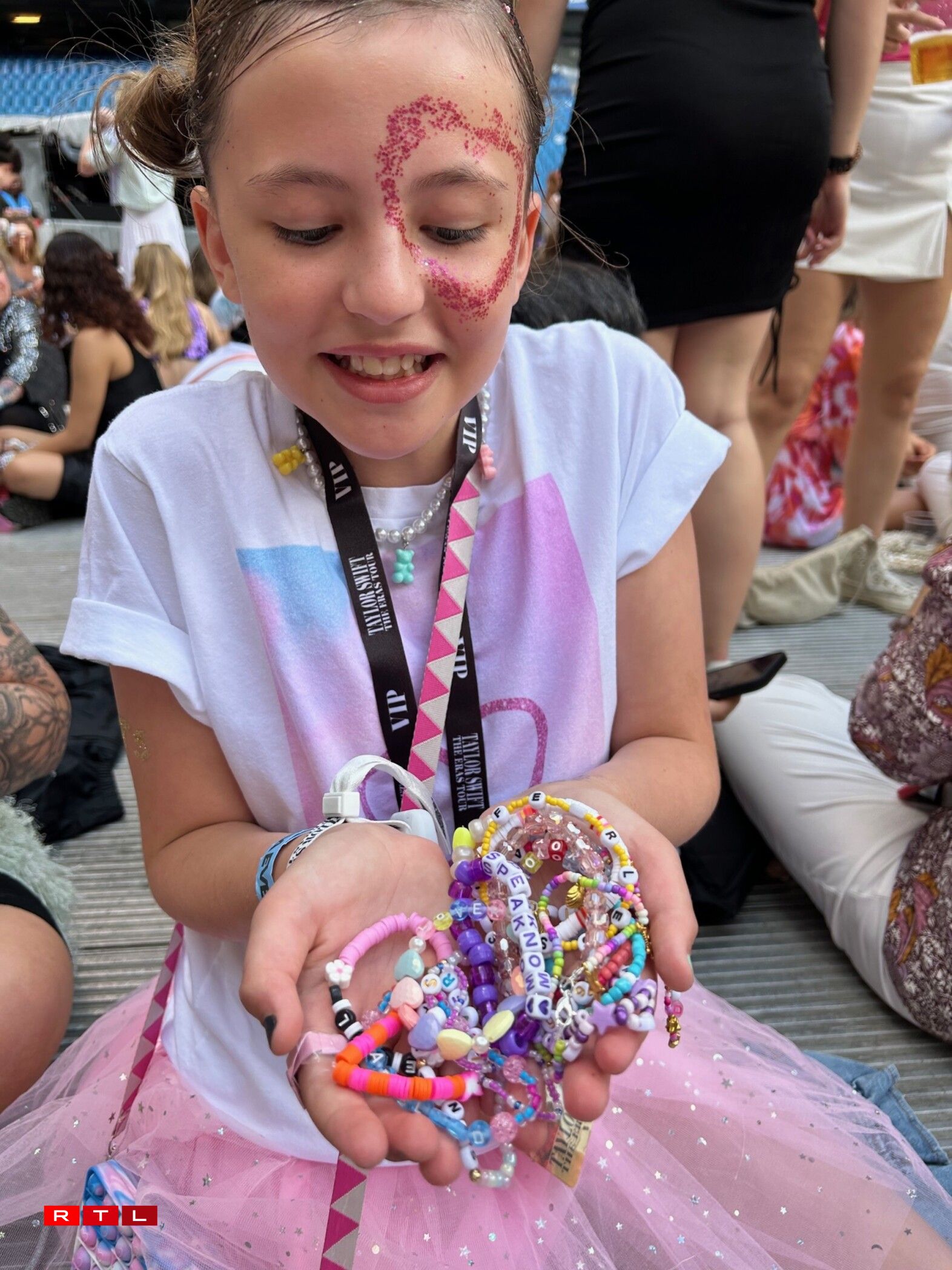 Dem Juno seng Famill huet dëst awer gäre fir d’Meedche gemaach. An d’Juno? Dat huet all Erënnerunge vum Concert an enger Këscht gesammelt. Eng 50 Frëndschaftsbraceletten, déi hatt mat anere Swiftië getosch huet, Stickeren, d’Ticketen an de VIP-Pass.