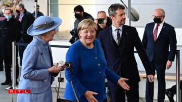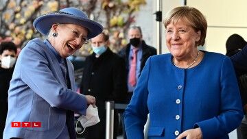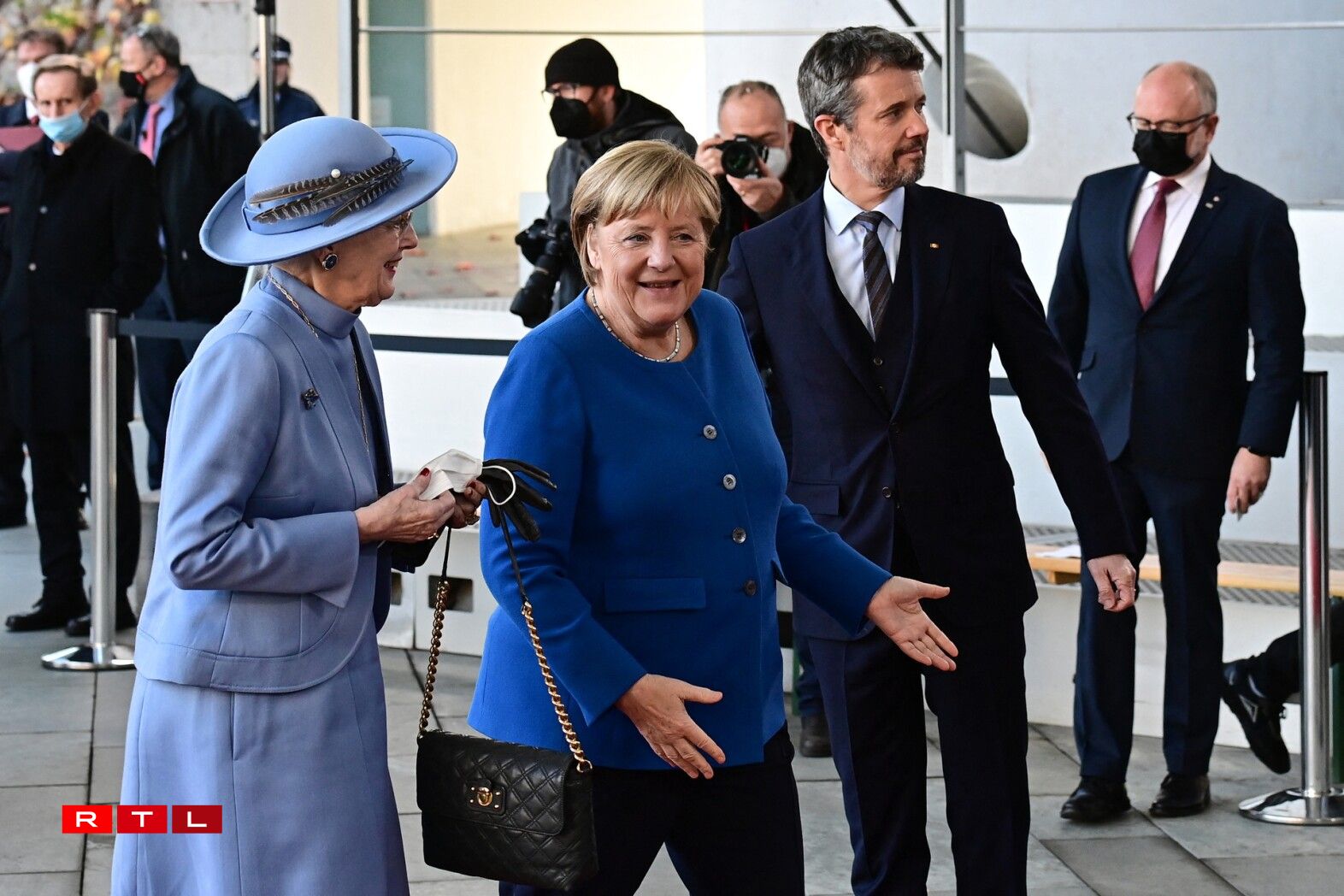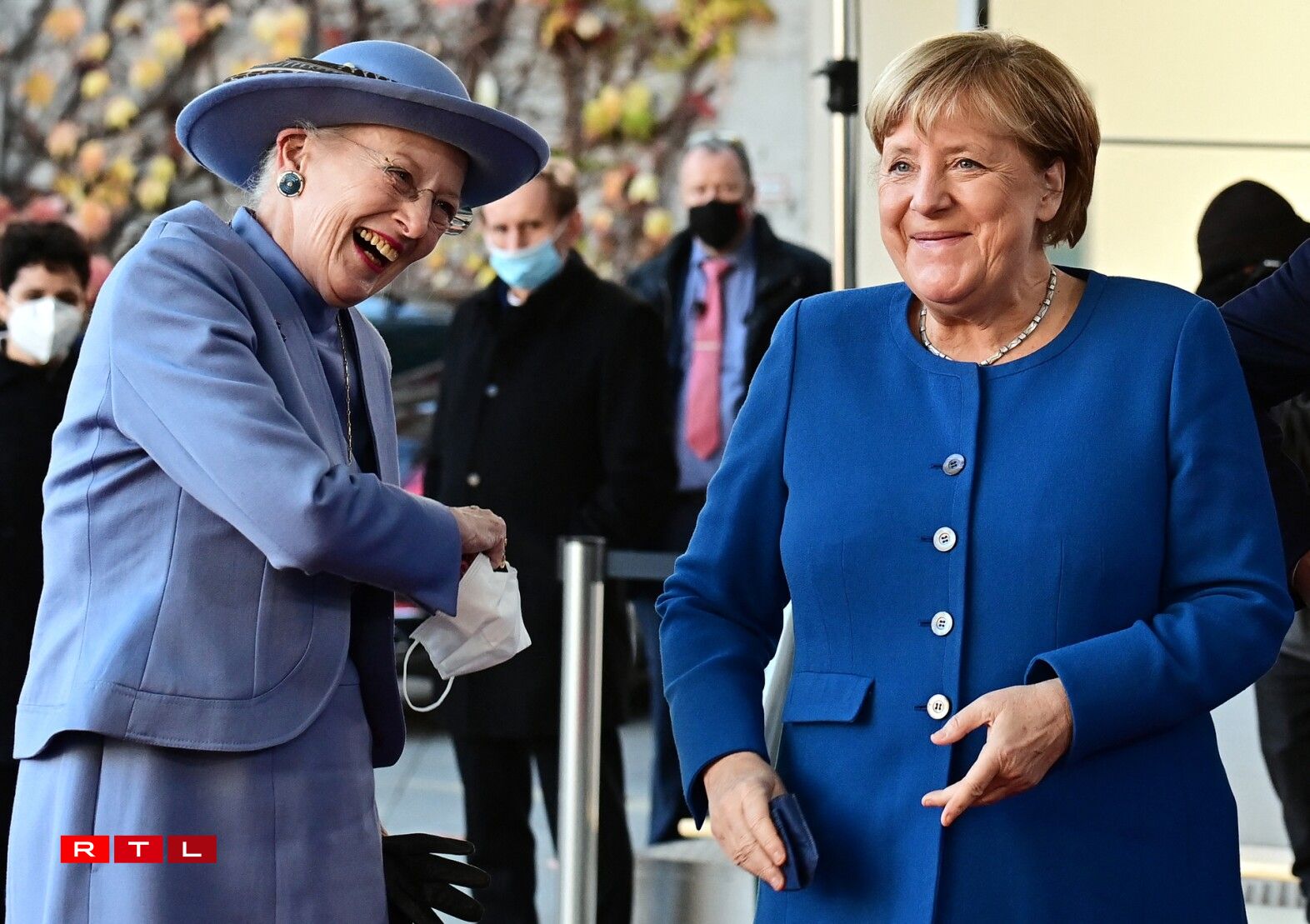 E Mëttwoch de Moien ass déi 81 Joer al Monarchin um militäreschen Deel vum Berliner Fluchhafe gelant. Mat engem häerzleche Laache sti sech kuerz drop béid Powerfraen, Angela Merkel a Kinnigin Margarethe, géintiwwer.