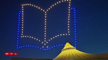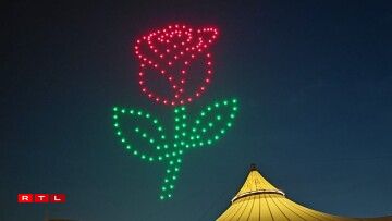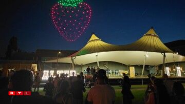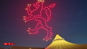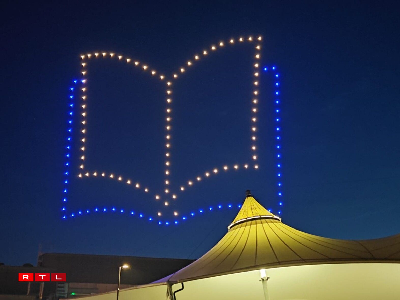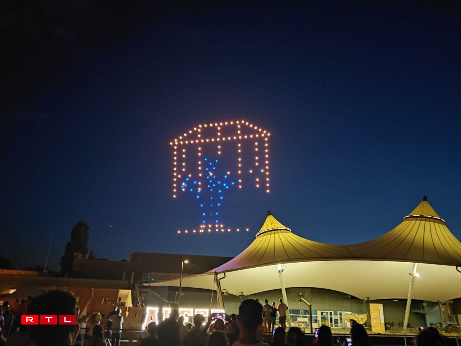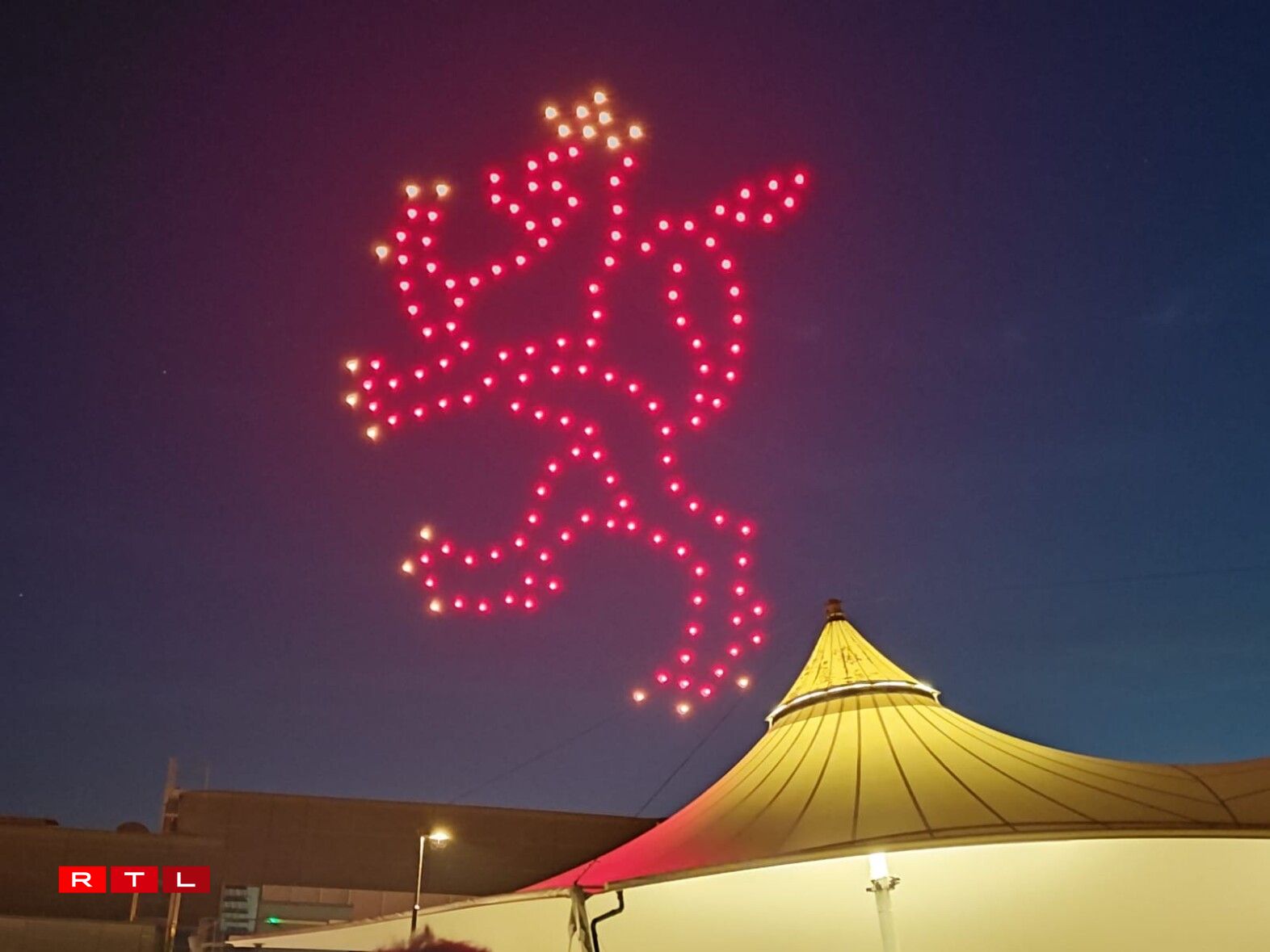D’Drone sinn hin- an hiergebëselt an hunn zum Beispill d’Kierch, e Buch, eng Äerdbier, eng Rous, de Roude Léiwe duergestallt, éier se rëm – natierlech nees an den Nationalfaarwen – hannert de Sportshale mam markanten Zeltdaach virdru verschwonne sinn.