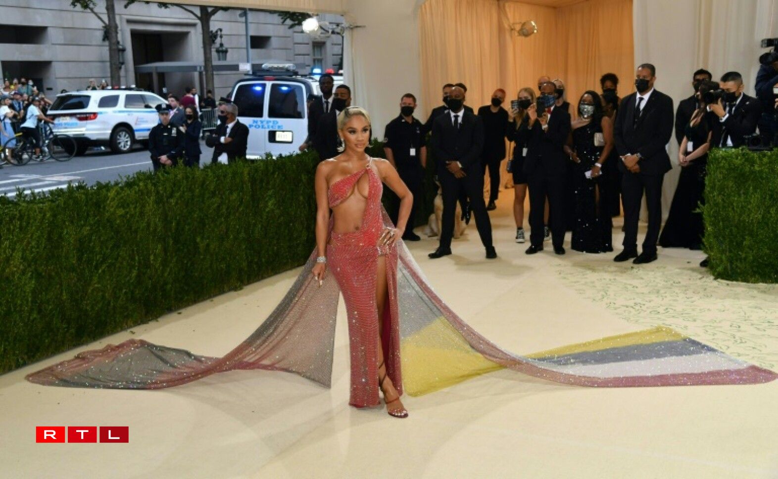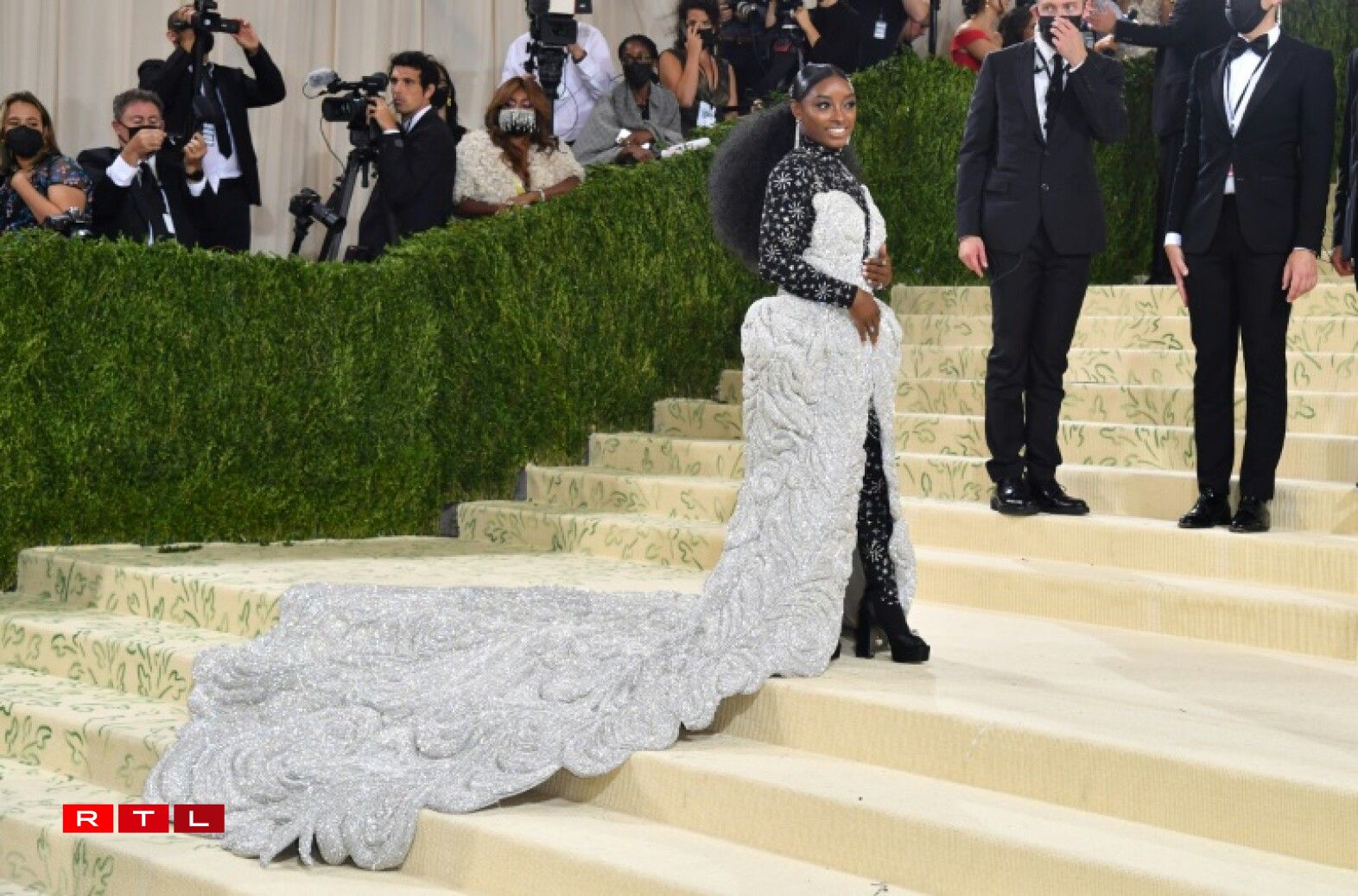 D’Sängerin Billie Eilish, déi dëst Joer moderéiert huet, hat een “apricotfaarwege” Rack mat enger meterlaanger Schleef un. D’Glitzerkleed vun der Turnerin Simone Biles war esou schwéier, datt d’Rekord-Weltmeeschterin all Träpplek huet missen eenzel “eropklammen”. De Rapper Lil Nas X hat dräi gëllen Tenuen iwwereneen un, déi hien op der Trap eenzel presentéiert huet.