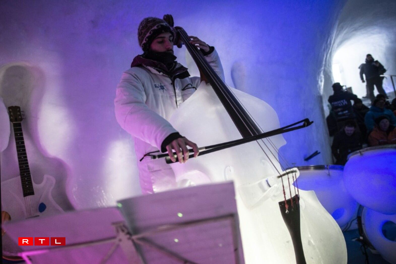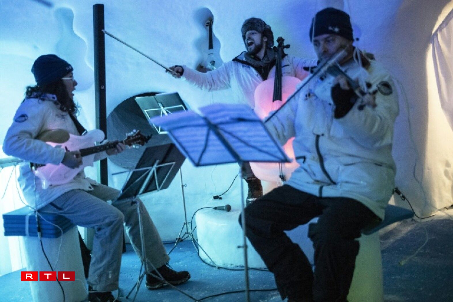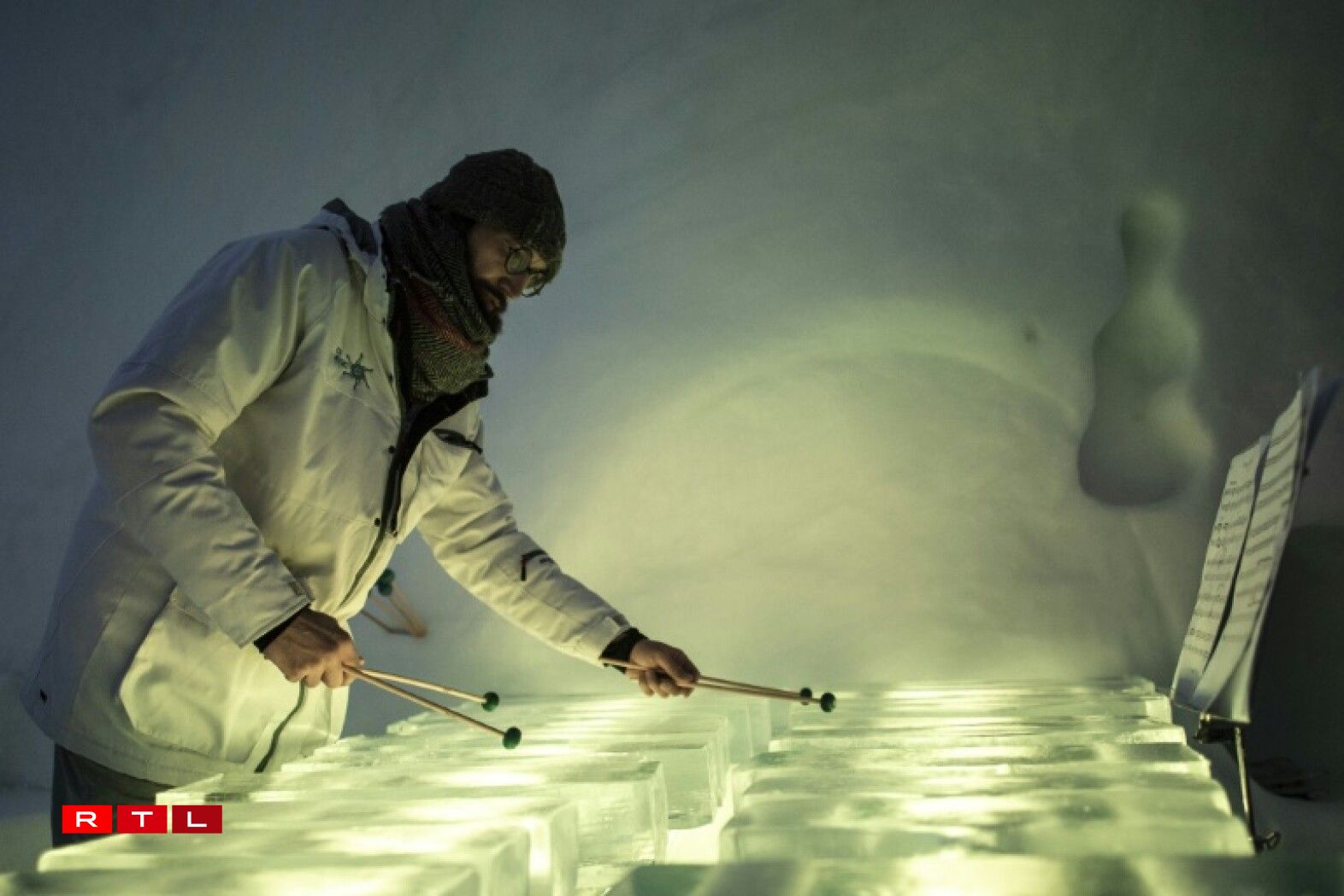 Viru Kuerzem huet hien dann och zesumme mat anere Museker e Concert an den italieneschen Alpe ginn. Hei souz de Public an engem Iglu ganz aus Äis an duerft dem Klang vun der “Äis-Musek” nolauschteren ...