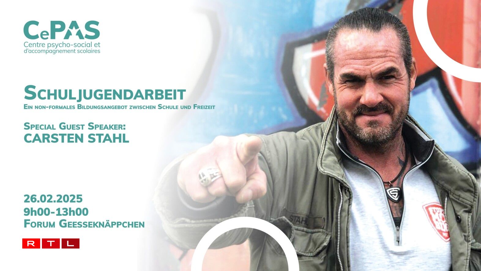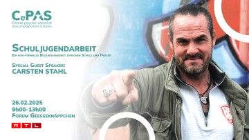 De Carsten Stahl presentéiert de 26. Februar um Geesseknäppchen säin Anti-Mobbing-Schoulkonzept. De fréieren Acteur aus der Serie “Privatdetektive im Einsatz”, an där hien 289 Mol ze gesi war, huet sech d’Aarbecht mat Jonken zur Liewensaufgab gemaach. Hie geet a Schoulen a schwätzt virun hinnen a mat hinnen. Um Geesseknäppchen ass hien op Invitatioun vun dem CePAS (Centre psycho-social et d’accompagnement scolaires). Zil ass et d’Potential vun ALL Schüler ze fërderen.