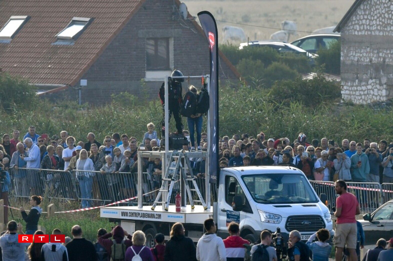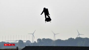 Fir déi ronn 35 Kilometer aus Nordfrankräich, iwwert d’Manche bis op Dover, huet den als “Homme volant” bekannte Fransous ronn 20 Minutte gebraucht. De Sprit, deen hien an engem Rucksak bei sech huet, geet awer just duer fir d’Halschent vun der Streck, dofir muss op hallwem Wee nogetankt ginn.