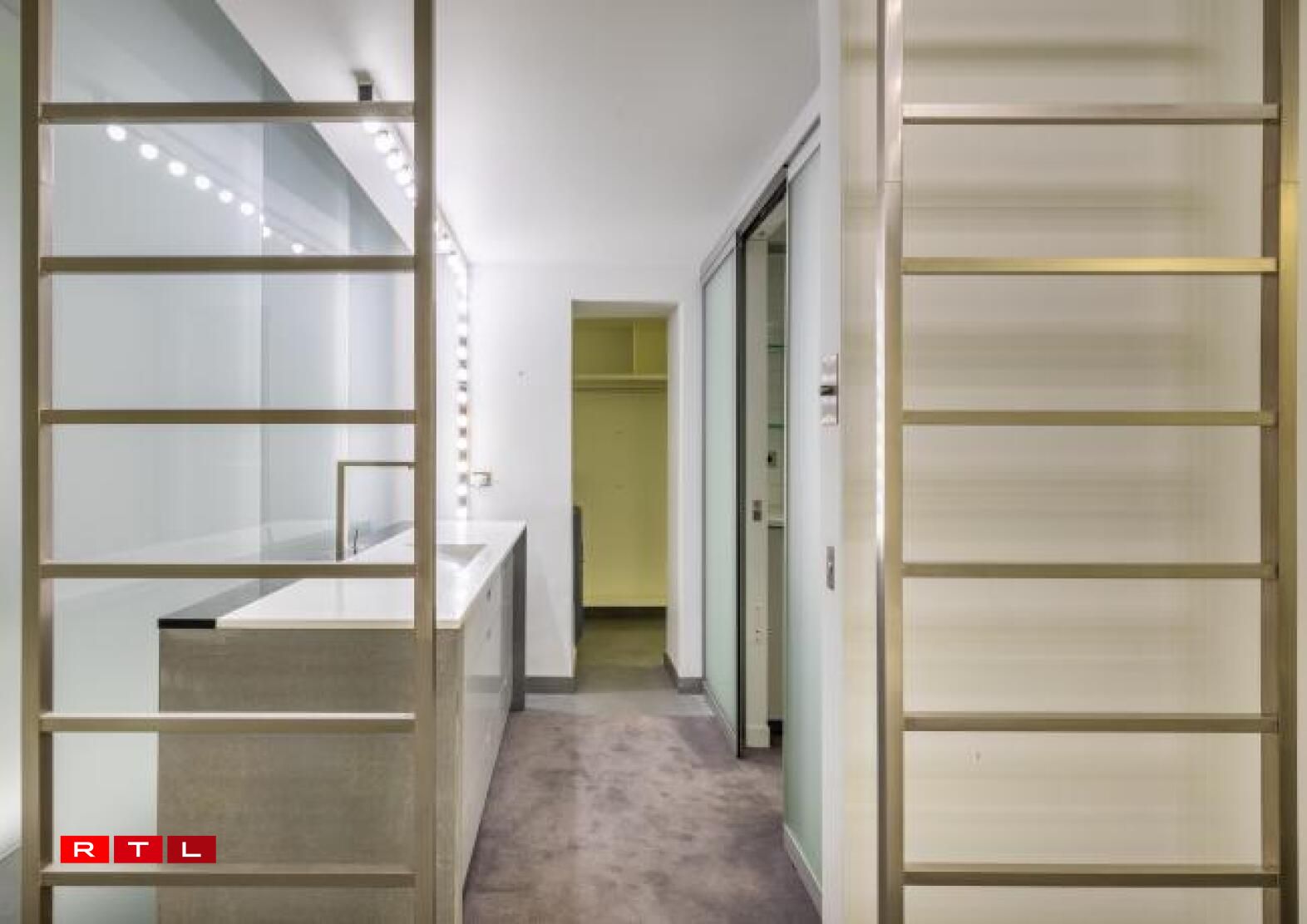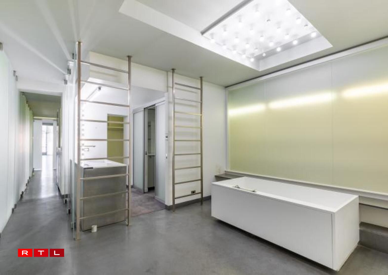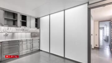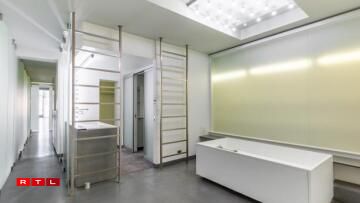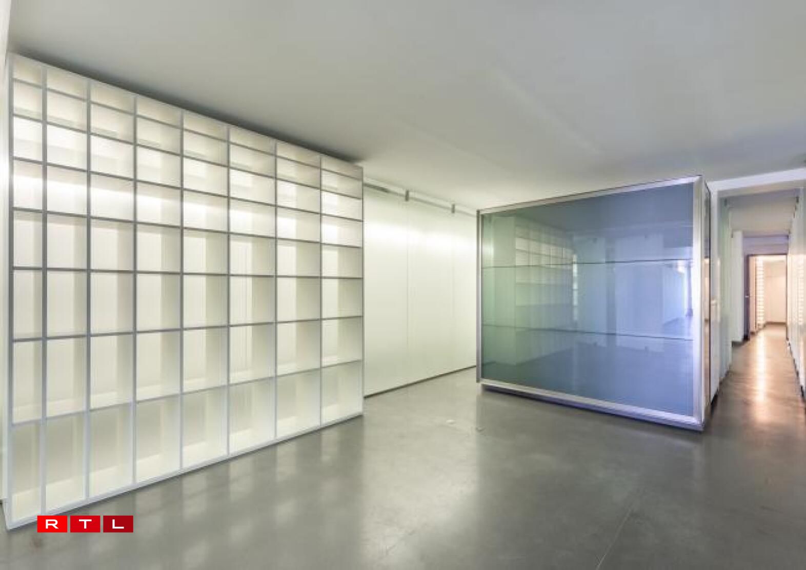 Nieft dem groussen Ukleedzëmmer kann dës Wunneng och nach mat engem ganz besonnesche Virbesëtzer trompen. Dat war nämlech keen anere wéi de Karl Lagerfeld. Déi futuristesch gehale Residenz huet zwar just 3 Zëmmer, ma déi verdeele sech op ganzer 260 Quadratmeter. Renovéiert gouf se och nach net virun all ze laanger Zäit an dat mat vill Bëtongsbiedem an Trennwänn aus sandbestraaltem Glas. D’Haaptzëmmer ass 120 Quadratmeter grouss an do ginn et nach eng Rei gréisser Bicherregaler.