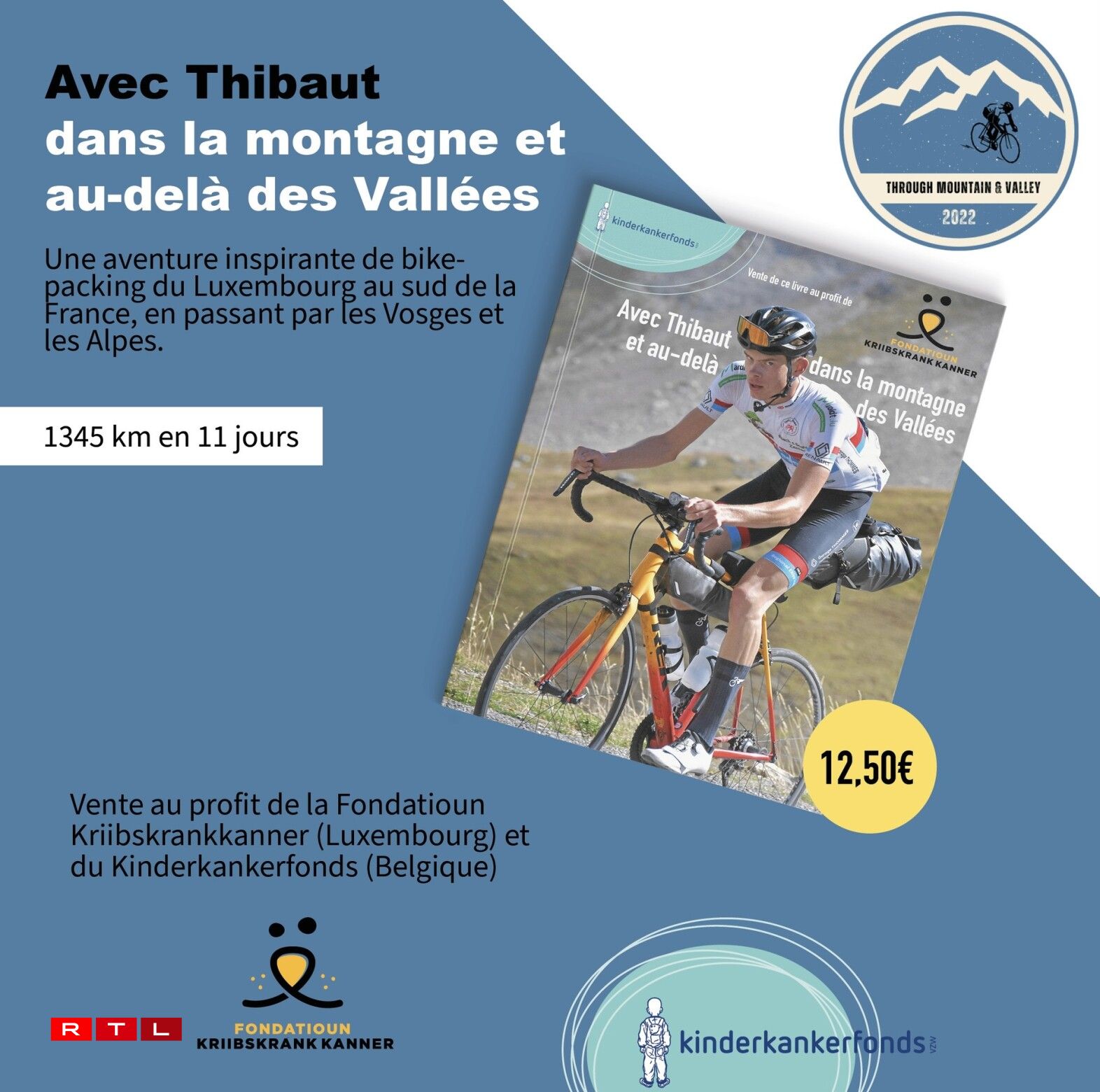 1.345 km huet den Thibaut van den Heuvel an 11 Deeg um Vëlo gedréckt, an d’Resultat ass e Buch fir d’Fondatioun Kriibskrank Kanner. Mat 3 Méint war bei him Leukemie festgestallt ginn an 20 Joer méi spéit wëll hie sech dankbar weisen an eppes erëmginn. Dofir sammelt hien elo Suen a wëll all de Jonken an hiren Eltere Courage maachen, déi am selwechte Fall si wéi hien deemools. Alles ënnert dem Motto ‘wou ee Wëllen ass, ass och e Wee’. Hie vergläicht d’Krankheet fir de Patient mat engem héije Bierg, deen een erop muss kraxelen, a sou war hien an de Vogeesen an an den Alpen ënnerwee.