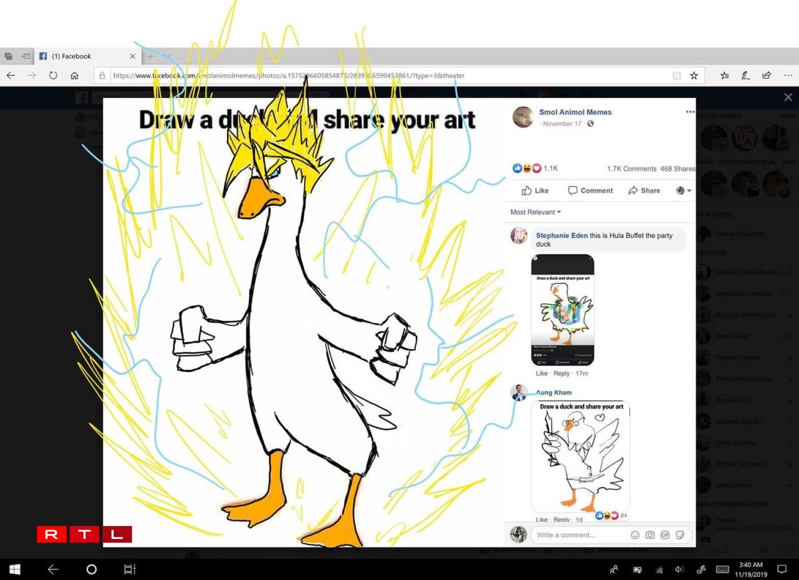 Un Hand vun enger Virlag (Schniewel a Féiss) sollen d’Internauten eng Int molen... Dobäi koume richteg cool Saachen eraus. Op der Facebook-Säit Smol Animol Memesgoufen d’User opgeruff, fir un Hand vun enger Virlag e Bild vun enger Int ze molen. Dobäi koume ganz witzeg, ganz kuriéis a ganz speziell Biller eraus. Verschidde Moler hu souguer richteg Talent...