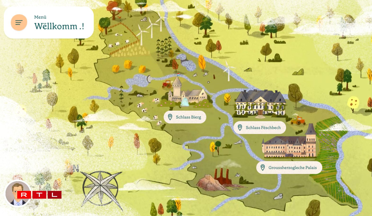 Den neie Site hëlt d’Kanner mat op eng virtuell Rees op déi symbolesch Plaze vun eiser Monarchie: de Palais an der Stad, souwéi d’Schlass Bierg a Fëschbech. Mat net just, hei kritt een och emol en Abléck an de Schlassgaart oder wien alles am Palais beschäftegt ass.