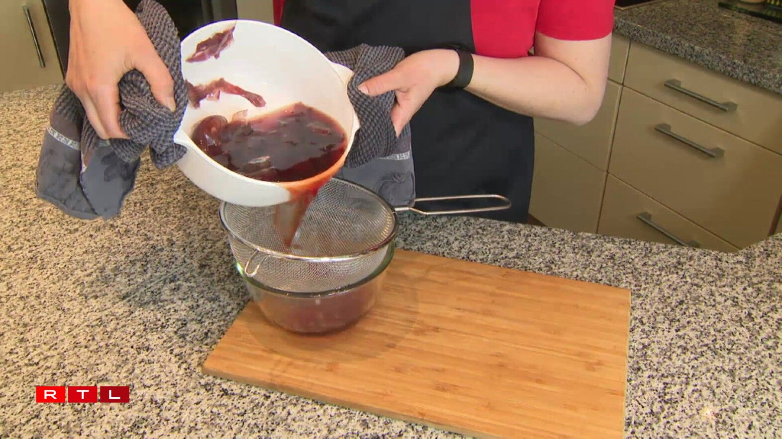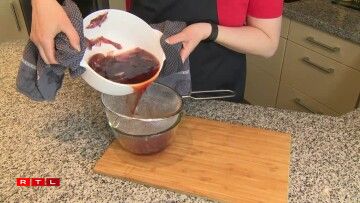 Fir eng donkelrout bis brong Faarf, kann een d’Schuel vun der Ënn huelen. Hei gëllen 35 Gramm op 1 Liter Waasser. An och dat soll 40 Minutte goen.