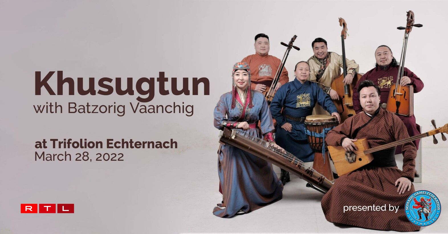 De Mathieu Schiltz bréngt e Méindeg den 28. Mäerz eng mongolesch Folk-Band op Iechternach, déi beim asiatesche Supertalent zweet ginn ass. De President vun der “Nomadic Games Federation Lëtzebuerg” huet d’Museker vun “Khusugtun” 2018 kennegeléiert a souguer mat hinne geüübt, an no villen organisatoresche Schwieregkeeten huet hien et fäerdeg bruecht, déi 6 Museker op Iechternach z’invitéieren. E Méindeg den 28. Mäerz komme si an den Trifolion a suerge fir en aussergewéinleche Concert.