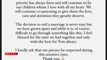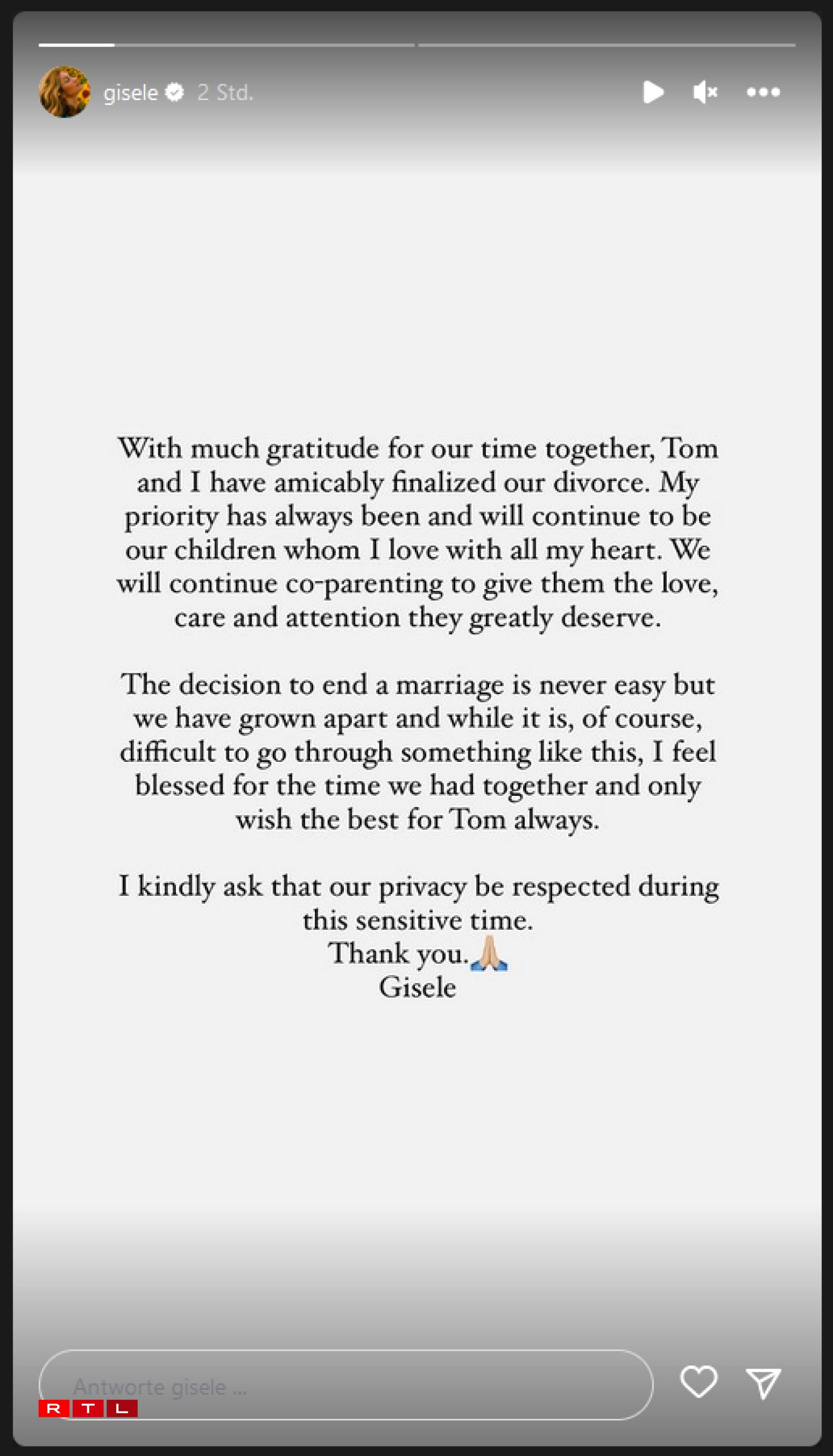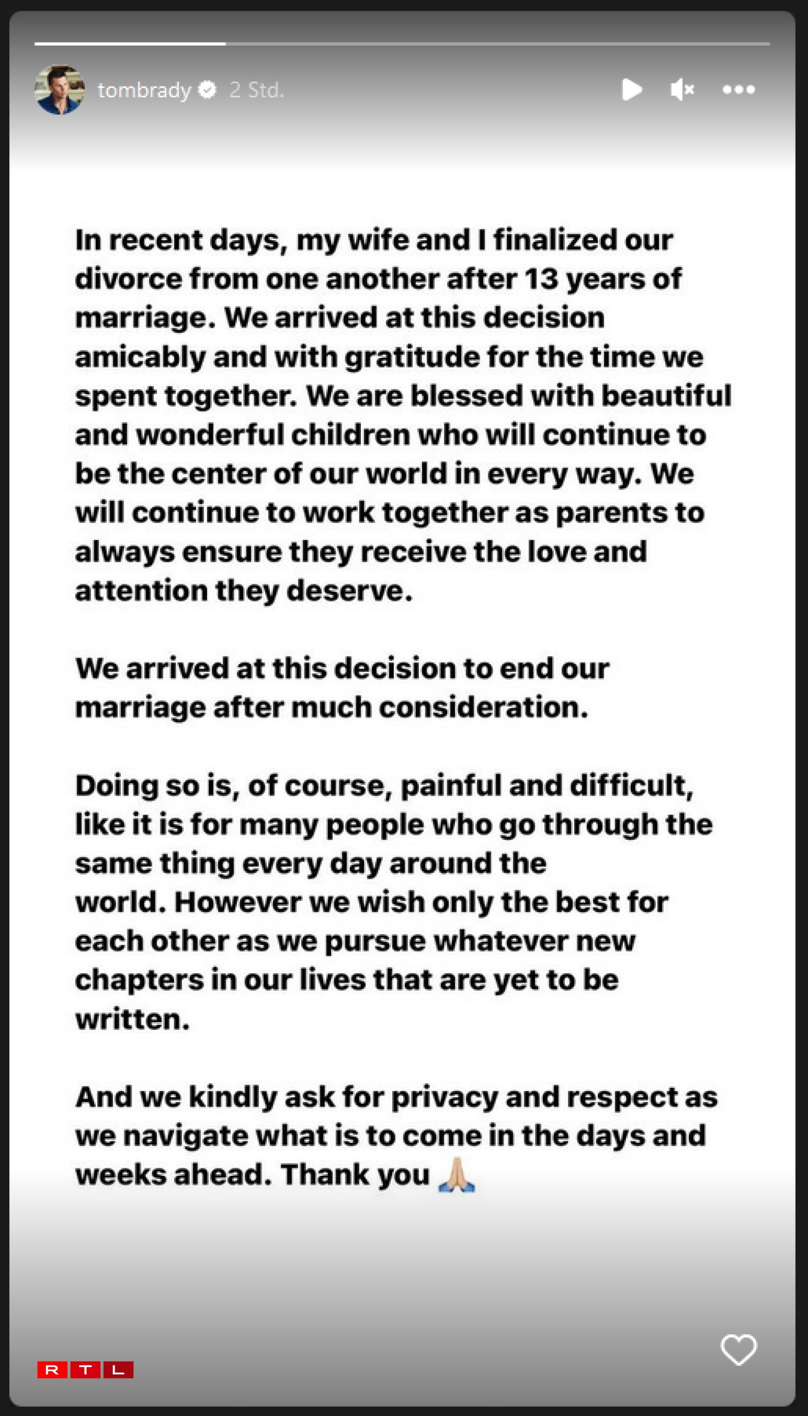 D’Model an de Footballspiller sollen d’Decisioun awer “kollegial” getraff hunn. Déi 42 Joer al Gisele Bündchen huet geschriwwen, datt d’Decisioun sech scheeden ze loossen, “ni liicht” wier, ma si hätte sech “auserneen entwéckelt, an och wann et schwéier ass, duerch esou eppes ze goen”, wier d’Model frou fir déi Zäit, déi d’Koppel hat an “wënscht dem Tom ëmmer dat Bescht”. Och de Quarterback vun den Tampa Bay Buccaneers huet geschriwwen, hie géing “an Dankbarkeet fir d’Zäit”, déi si “zesumme verbruecht hunn”, op hir Bezéiung zréckkucken. “Mir si mat wonnerbare Kanner geseent, déi weiderhin all Dag am Mëttelpunkt vun eiser Welt si wäerten”.