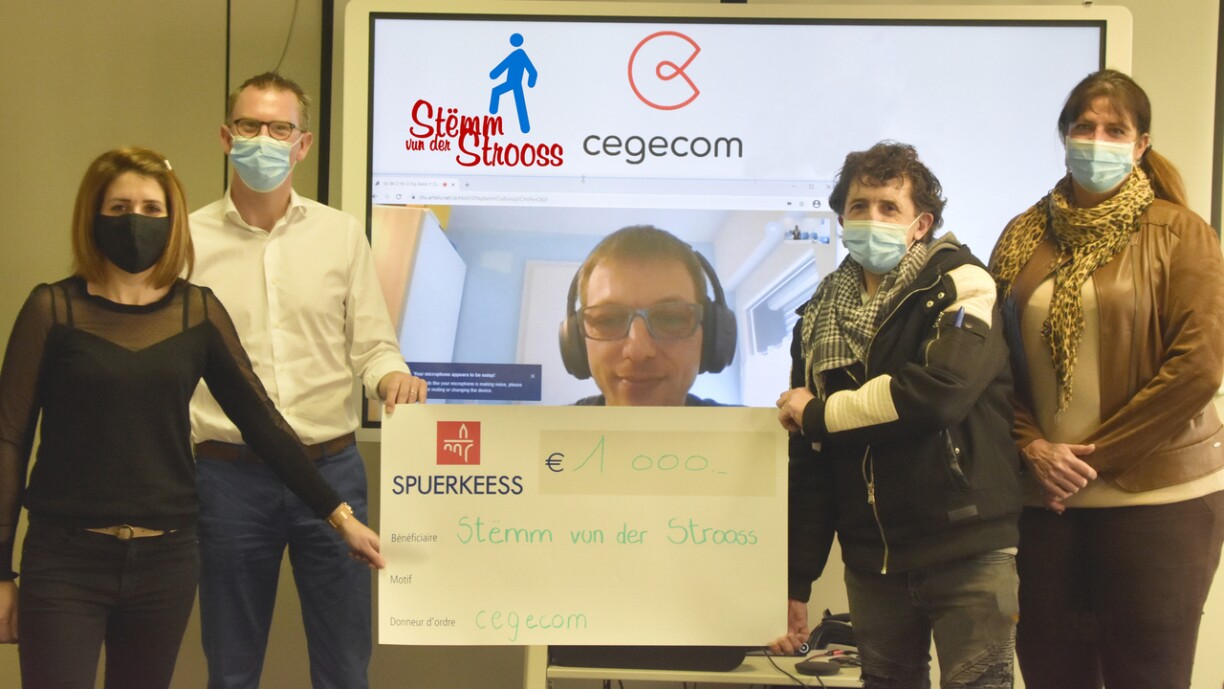 cegecom s.a., alternativer Telekommunikationsanbieter in Luxemburg, hat sich in diesem Jahr entschieden, Menschen in der beruflichen Wiedereingliederung durch den Verein Stëmm vun der Strooss zu unterstützen. Die Personaldelegation ist der Urheber der 1.000-Euro-Spende. Die Übergabe erfolgte auf dem Firmengelände in der Rue Piret 3 auf der Cloche d´Or. Die Personalvertreter Gregory Prym und Thomas Tilk (virtuell anwesend) sowie Sarah Koenig, Marketing Managerin, begrüßten das Team der Stëmm vun der Strooss.
