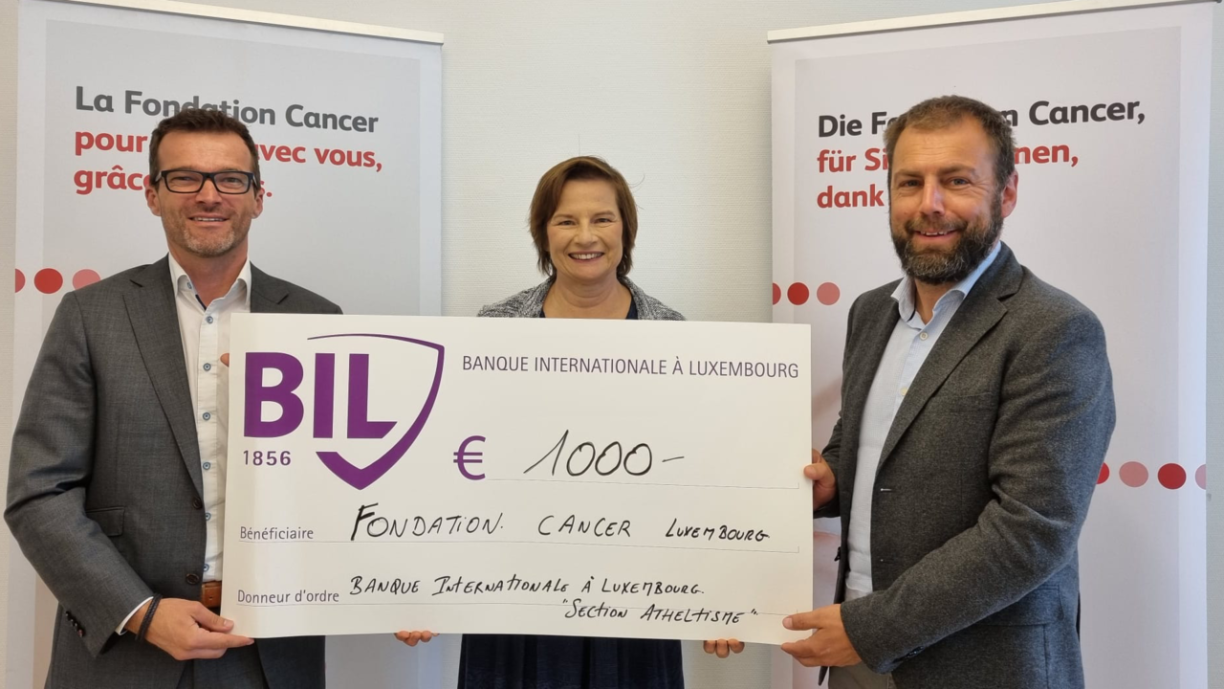 Am Aklang mat hirem reegelméissegen Engagement wärend dem Relais pour la Vie hunn d’Membere vun der Sportsgrupp vun der Banque Internationale à Luxembourg (BIL) sech fir eng Course mobiliséiert an den Erléis un d‘Fondation Cancer gespent. Duerch dës Solidaritéits-Aktioun konnt eng Zomm vun 1.000 € un d‘Fondation Cancer iwwerreecht ginn. D’Direktesch, Lucienne Thommes, huet allen Bedeelegten häerzlech Merci gesot fir hir onermiddlech Ënnerstëtzung. Dës Aktiounen erméiglechen der Fondation Cancer hir Missioune weider ze realiséieren: Informéieren, hëllefen an d’Fuerschung ënnerstëtzen.
