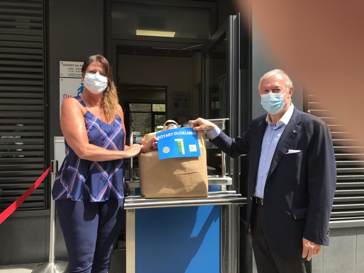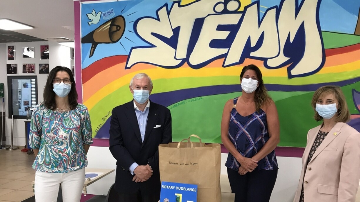 Die Vertreter des Düdelinger Rotary Club, darunter der Präsident Antoine Hientgen, Myriam Feyder und Danielle Schroeder, spendeten am 8. Mai der Stëmm vun der Strooss 1 000 Gesichtsmasken. Dank dieser großzügigen Spende konnten am 11. Mai die 150 Personen, die im Rahmen einer Wiedereingliederungsmaßnahme bei der Stëmm beschäftigt sind, ihre Arbeit wiederaufnehmen. Des Weiteren wurde ein Teil der Masken an die Besucher der zwei Sozialrestaurants in Luxemburg sowie Esch/Alzette verteilt.