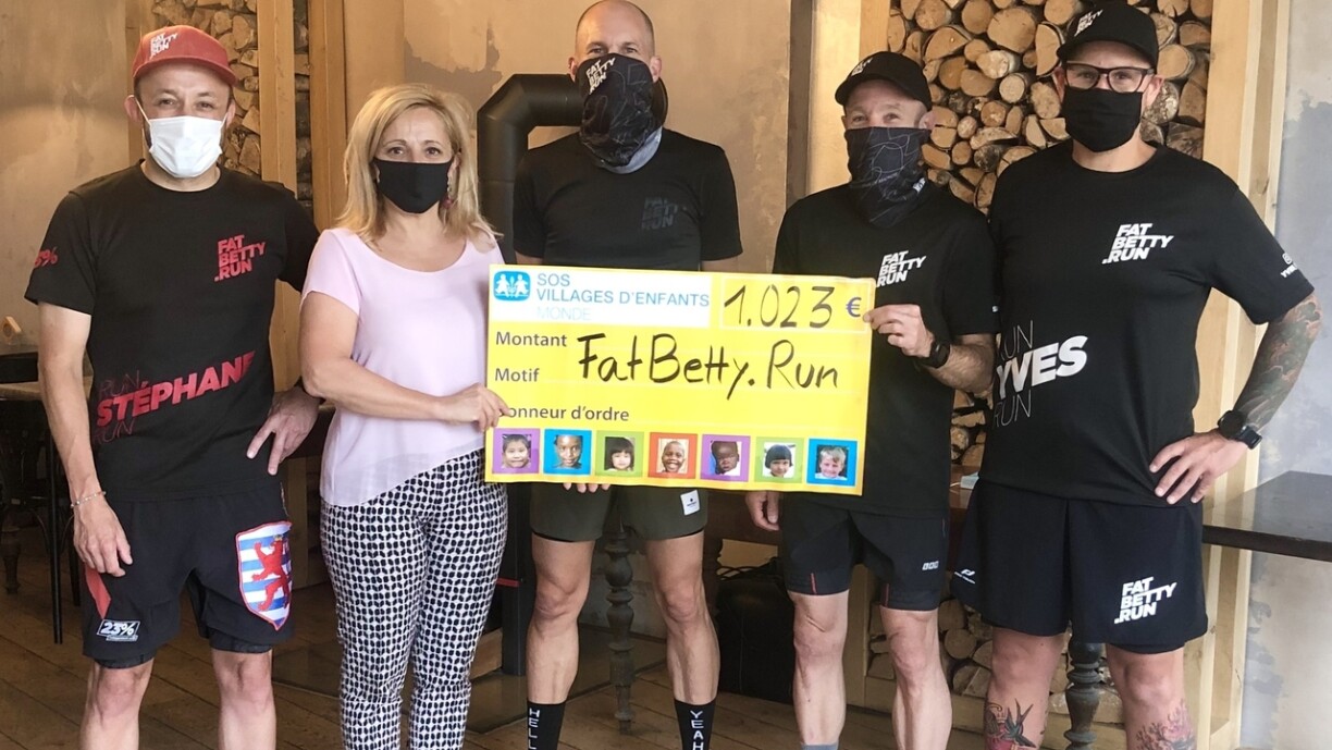 « Un petit grain de folie », telle est la devise de l’équipe de coureurs de FatBetty.Run. Cette fois-ci, « un petit grain de solidarité » s’est mêlé à la folie. En témoigne la vente d’une médaille et d’un buff - qui peut d’ailleurs servir de masque - pour la course virtuelle All Black Medal organisée par l’équipe en raison de la crise liée au Covid-19. Résultat : FatBetty.Run a collecté 1.023€ pour des enfants soutenus par SOS Villages d’Enfants. Avant de s’élancer pour sa traditionnelle course 10K, l’équipe de FatBetty.Run s’est réunie à l’Independent Café au cœur de la Ville de Luxembourg pour remettre un chèque à SOS Villages d’Enfants Monde.