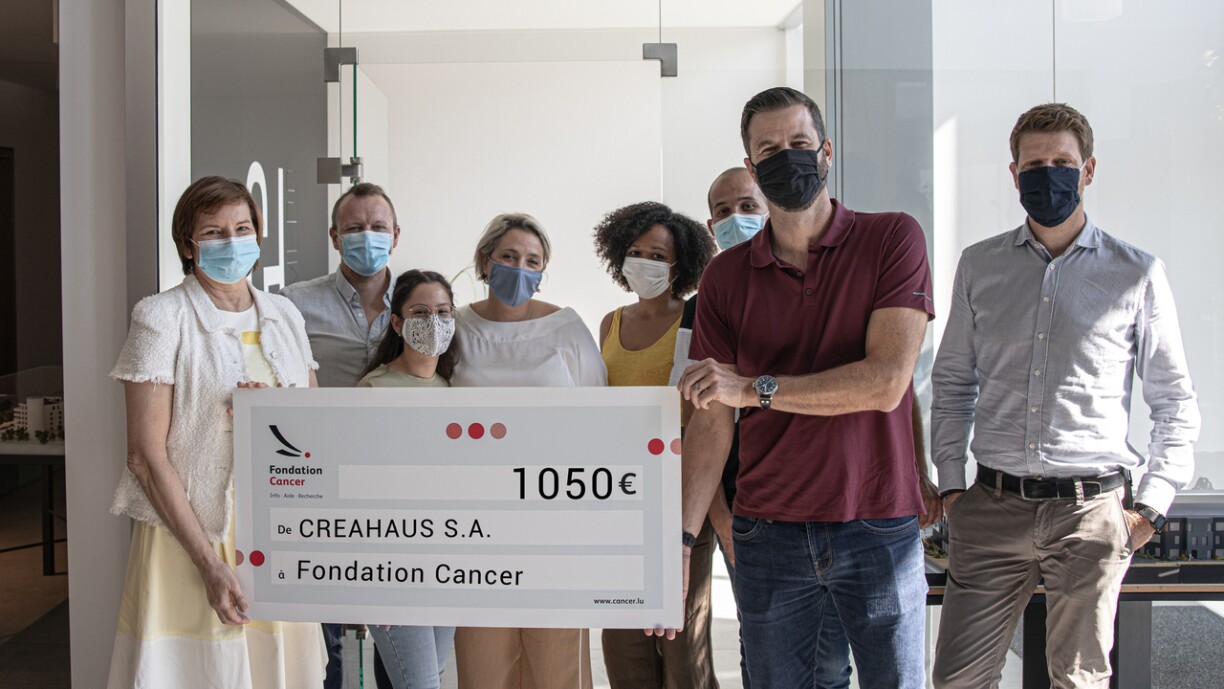 D’Kiischt um Kuch: D’Direktioun vu Creahaus wollt d’Initiativ vu senge Mataarbechter ënnerstëtzen an encouragéieren, andeems de gesammelte Betrag vun hinne verduebelt ginn ass. 1.050 € goufe vun den Organisateuren un d’Fondation Cancer gespent. D’Fondation Cancer ass dankbar fir dës generéis Initiativ, duerch déi se hir Servicer fir nozelauschteren, ze beroden an ze informéiere weiderféiere kann.