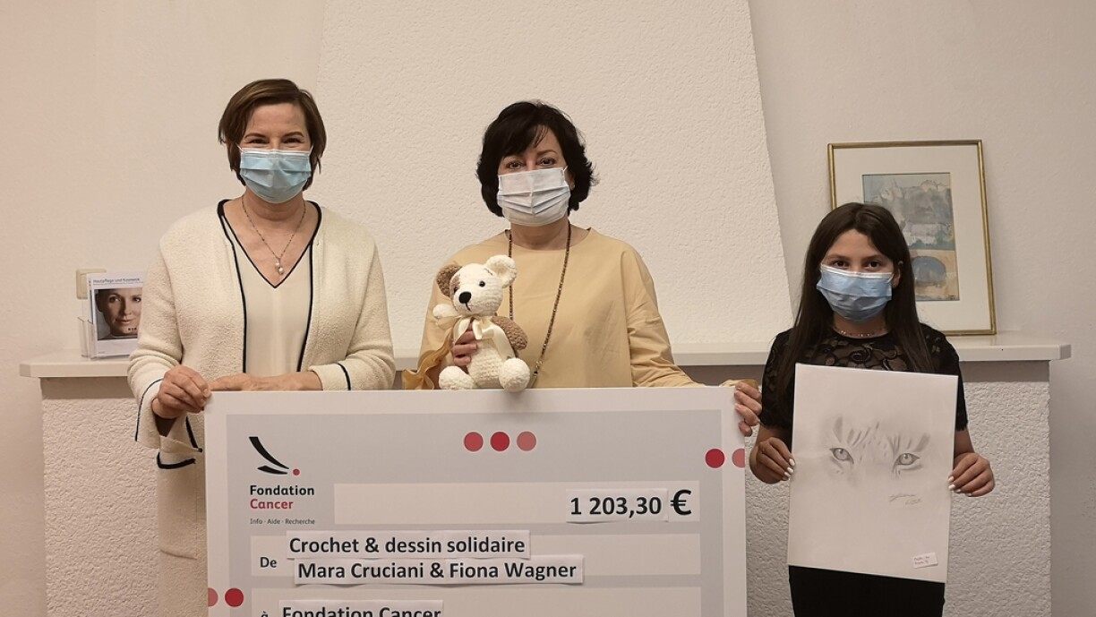 La directrice de la Fondation Cancer, Lucienne Thommes, les recevait pour les remercier pour cette généreuse donation de 1 202,30 €. Cette somme est en partie le fruit de la vente de peluches et dessins imaginés et créés par ces fidèles donatrices. Dans cette situation particulière, les patients et leurs familles ont plus que jamais besoin de soutien. La peur, l’incertitude sur l’avenir, la vie au conditionnel, ils les connaissent intimement. C’est grâce au soutien de ses généreux donateurs que la Fondation Cancer peut continuer à les soutenir et proposer ses offres d’écoute, de conseil et d’information.