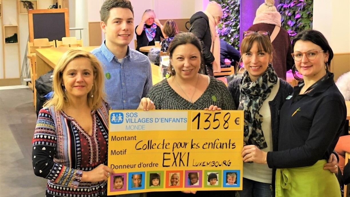 Le 22 janvier, Marie-Laure Pierson, Superviseure chez EXKi Luxembourg, et Kevin Fabert, Assistant Marketing, ont invité Sophie Glesener, Directrice de SOS Villages d’Enfants Monde, et Anne Schweizer, Responsable Partenariats, dans le restaurant EXKi de la Grand-Rue pour leur remettre un chèque de 1.358€. Cette coquette somme, qui comprend les dons réunis sur les trois dernières années (2017-2019), sera attribuée aux projets de l’association qui visent à accompagner les enfants vulnérables dans le monde en mettant l’accent sur leurs droits, leur protection et leur bien-être.