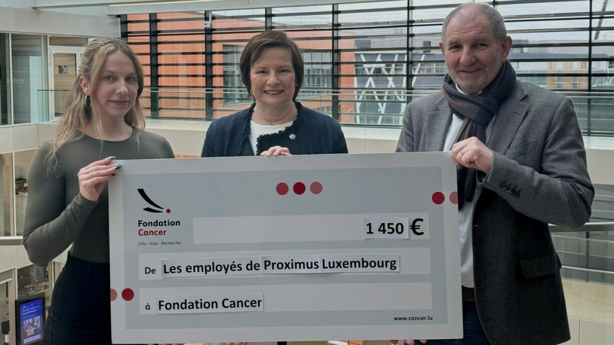 Doduerch konnt déi generéis Zomm vun 1.450 Euro dem Lucienne Thommes, Direktesch vun der Fondation Cancer, an de Raimlechkeete vu Proximus iwwerreecht ginn. “Proximus Lëtzebuerg engagéiert sech all Joer duerch Solidaritéitsaktiounen. Bei der Tombola fir Chrëschtdag hunn eis Mataarbechter dës flott Zomm gesammelt, fir de Kampf géint de Kriibs ze ënnerstëtzen. Dofir hinnen e grousse Merci!”, seet Groupe Proximus.