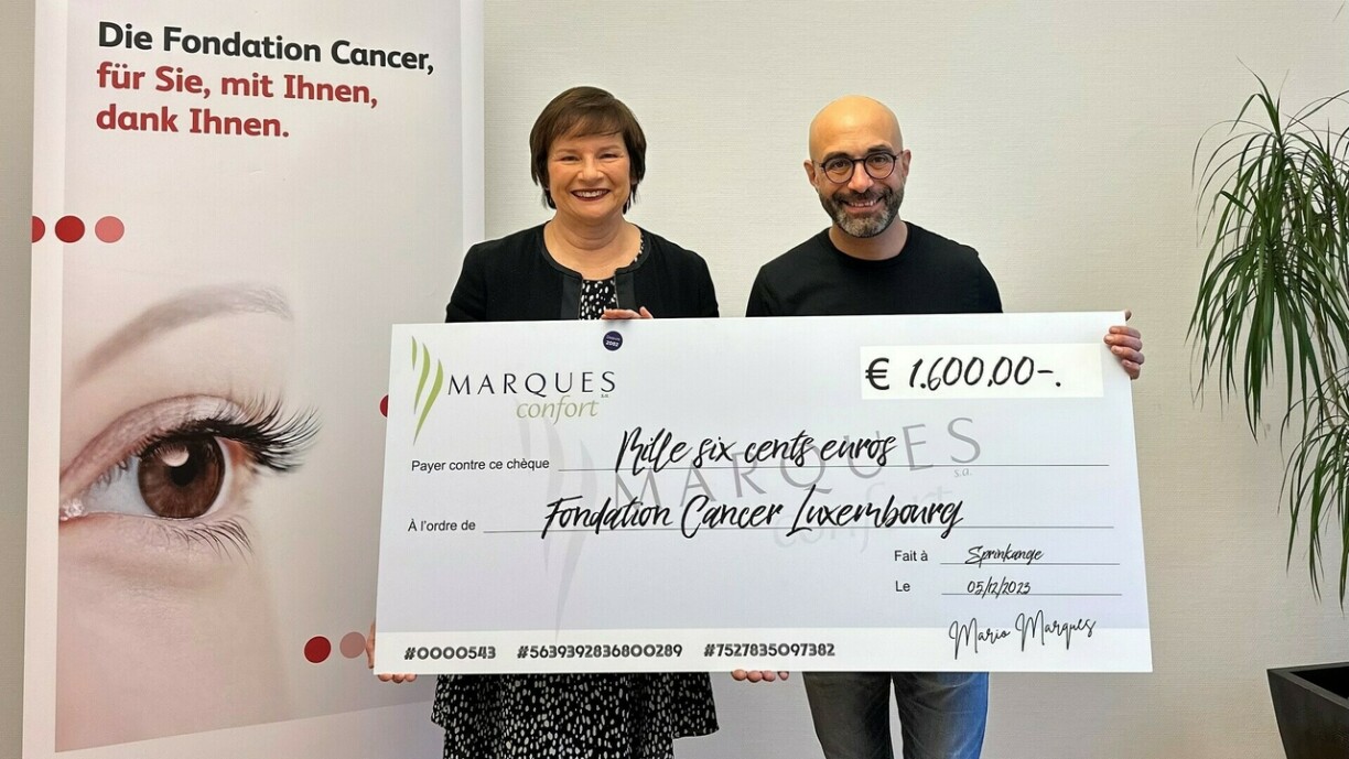 « Ech si ganz frou an houfreg dëse Scheck der Fondation Cancer ze iwwerreechen. E reflektéiert de gemeinsamen Engagement vun eiser Firma an eise Mataarbechter fir un Aktiounen deelzehuele fir eng Saach z’ënnerstëtzen déi eis all betrëfft. » seet de Monsieur Mario Marques, Gérant a Fondateur vu Marques Confort.