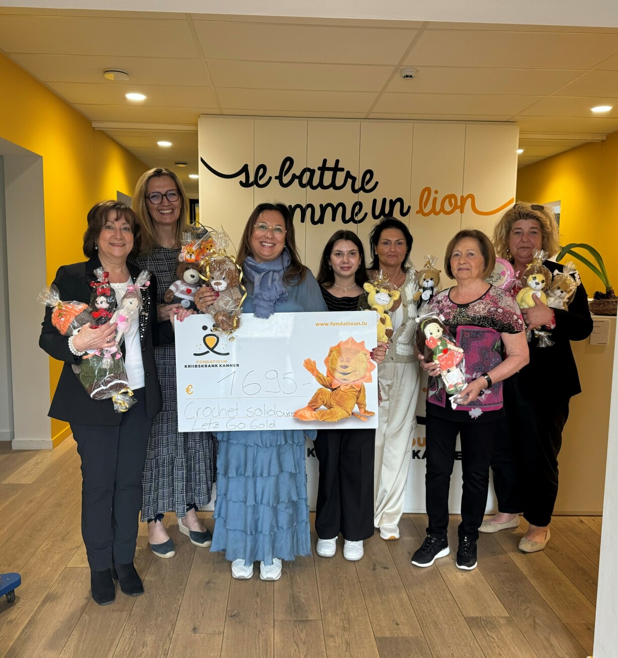 D’Mara Cruciani a seng Ekipp si ganz engagéiert wann et heescht eppes fir de gudden Zweck ze maachen. Et gi fantastesch Pëppercher oder Petzien an nach ganz vill aner flott Saache geheekelt, déi da vu Leit kaf ginn an dann och gespent gi fir de Kanner ee Laachen a Gesiicht ze zauberen. Dem Mara Cruciani ass et ganz wichteg dass d’Recherche am Kannerkriibs ënnerstëtzt gëtt fir dass déi kléng Patienten Traitementer an Medikamenter kréien déi manner toxesch sinn. An esou hunn huet de Crochet solidaire ee Scheck an Héicht vun 1.695 € iwwerreecht deen op d’Course solidaire Lëtz Go Gold gesat ginn ass, wou d’ganz Kollekt zu 100 % an d’Recherche vum Kannerkriibs geet.