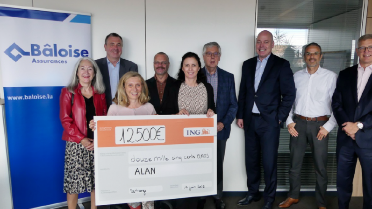 Pour l’occasion Romain Braas – CEO de Bâloise Luxembourg, Daniel Frank – direction Opérations, Alain Nicolai – direction Finance, Laurent Heiles – direction Commerciale et Laurence Fransen – direction ressources Humaines, se sont réunis pour accueillir et échanger avec les responsables de l’association (Shirley Feider-Rohen - Présidente d’ALAN asbl, Almuth Bredimus - Vice-Présidente, André Bredimus – ancien CEO de Bâloise Luxembourg, Daniel Theisen - chargé de direction) et officialiser cette donation.