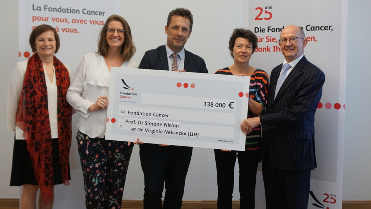 Im Rahmen der Forschungsförderung durch die Fondation Cancer haben Stiftungspräsident Dr. Carlo Bock und Geschäftsführerin Lucienne Thommes den Forscherinnen Prof. Simone Niclou (PhD) und Virginie Neirinckx (PhD) vom Luxembourg Institute of Health (LIH) in Anwesenheit von LIH-Direktor Ulf Nehrbass (PhD) einen Scheck über 138.000 € überreicht. Ziel ihres Forschungsvorhabens mit dem Titel Soluble LRIG1 for pan-Receptor Tyrosine Kinase targeting in glioblastoma ist die Untersuchung eines Proteins, das das Wachstum von Glioblastomen hemmen kann.