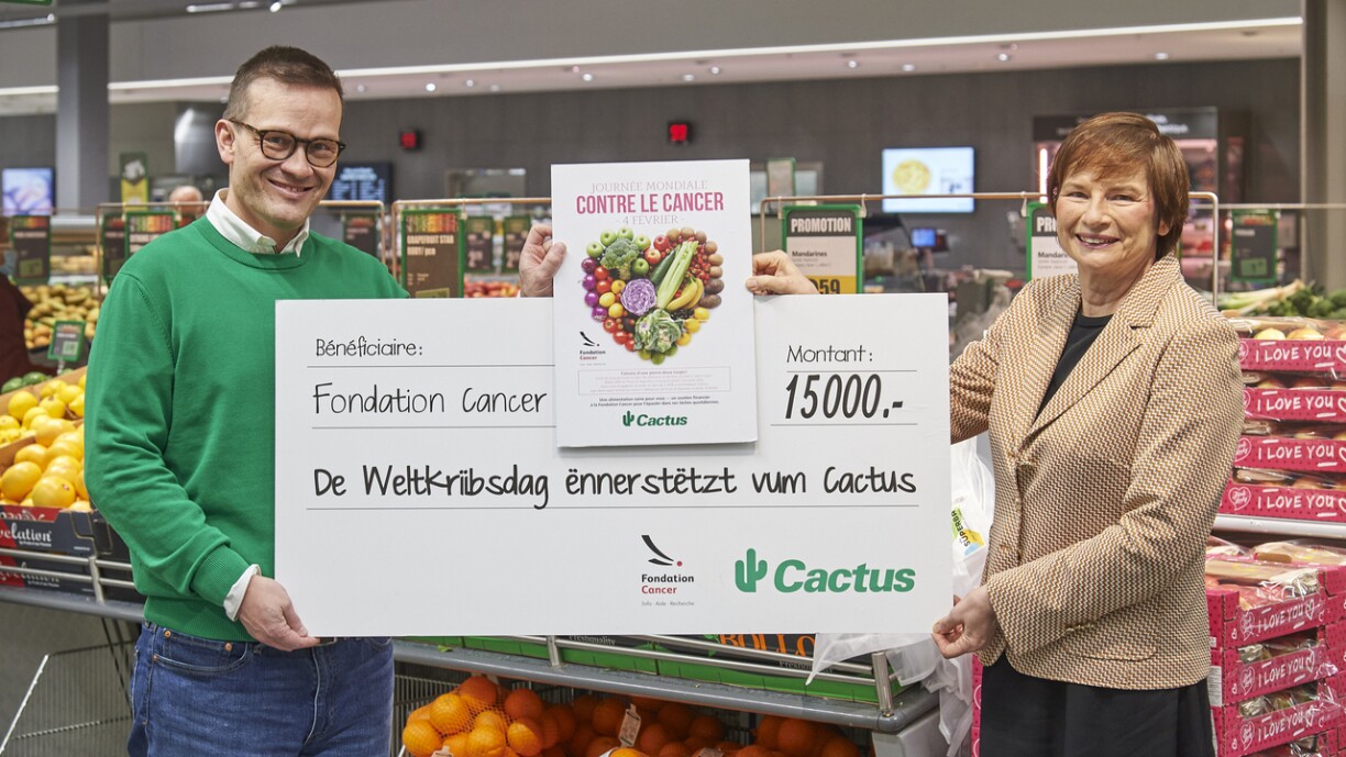 D’Direktesch, Lucienne Thommes, seet dem Cactus, awer och jiddwerengem, dee sech deen Dag dozou entscheet huet, gesond a frësch Produiten ze kafen, fir d’Fondation Cancer ze ënnerstëtzen, häerzlech Merci. Dësen Don wäert derzou bäidroen, fir d’Missioune vun der Fondation Cancer weiderhin ze realiséieren: Informéieren, hëllefen an d’Fuerschung ënnerstëtzen.