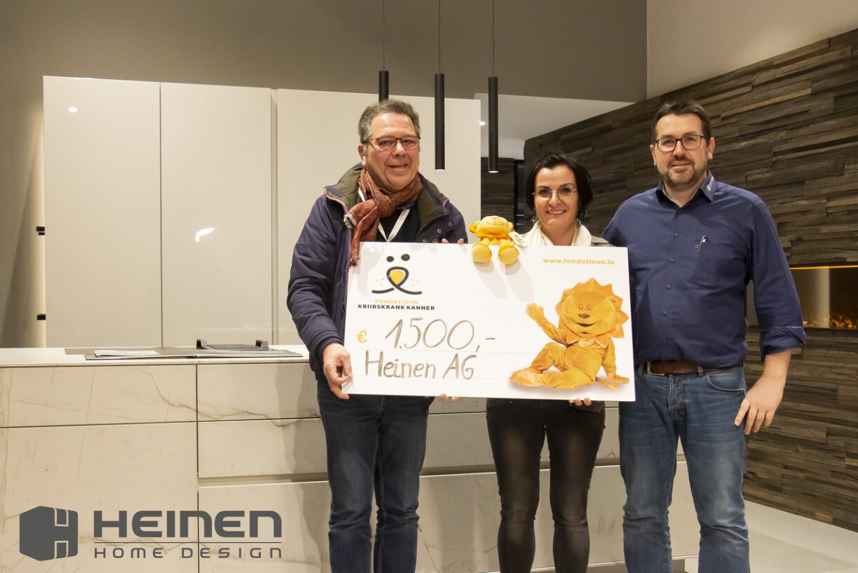 Den Här an Madamm Heinen, hate sech vum Enn vum Joer zesumme gedinn an hunn decidéiert keng Chrëschtdagskaarten ze schreiwen an och keng Knupperten fir Silvester an den Himmel ze schéissen, an hunn déi Suen, déi dofir virgesinn waren, fir eng gutt Aktioun geholl, a konnten dem Benevole, Romain Henrion vun der Fondatioun Kriibskrank Kanner ee Scheck vun 1500.-€ iwwerreechen.