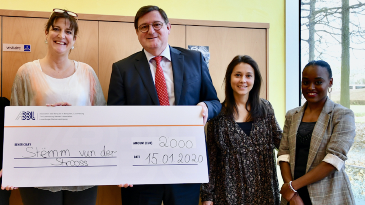 Am 15 Januar 2020, überreichte Yves Maas, CEO der Association des Banques et Banquiers Luxembourg (ABBL), welcher die Mitglieder der öffentlichen Arbeitsgruppe der ABBL, RSE, vertritt, einen Scheck in Höhe von 2000 € an die asbl “Stëmm vun der Strooss”.