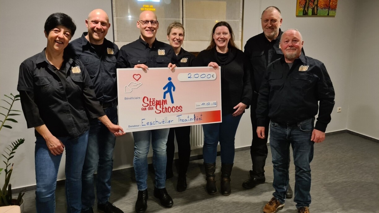 Am Freitag, dem 11 März 2022, übergab der Vorstand der Eeschwëller Theaterkëst einen Scheck in Höhe von 2 000 € an die Stëmm vun der Strooss, um das Projekt Caddy 2 des Vereins zu unterstützen. Für die ofizielle Spendenzeremonie und auf Initiative von Alain Klees, lud die Eeschwëller Theaterkëst, Sandra Karpen, Repräsentantin des Post-Therapie-Zentrums der Stëmm vun der Strooss in Schönfels, zum Abendesen in der Gemeinde Wiltz ein.