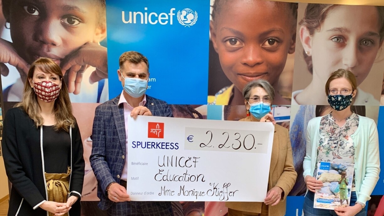 Suite au départ en retraite de Madame Monique Kieffer, directrice de la Bibliothèque nationale du Luxembourg (BnL), l’équipe a collecté 2.230 € en faveur du projet « Conceptos Plasticos » de l’UNICEF, qui a pour objectif de construire des écoles à partir de briques en plastique recyclé.UNICEF Luxembourg tient à remercier la BnL, ainsi que Mme Kieffer, qui a souhaité convertir son cadeau de départ en un don généreux de 2.230 €.