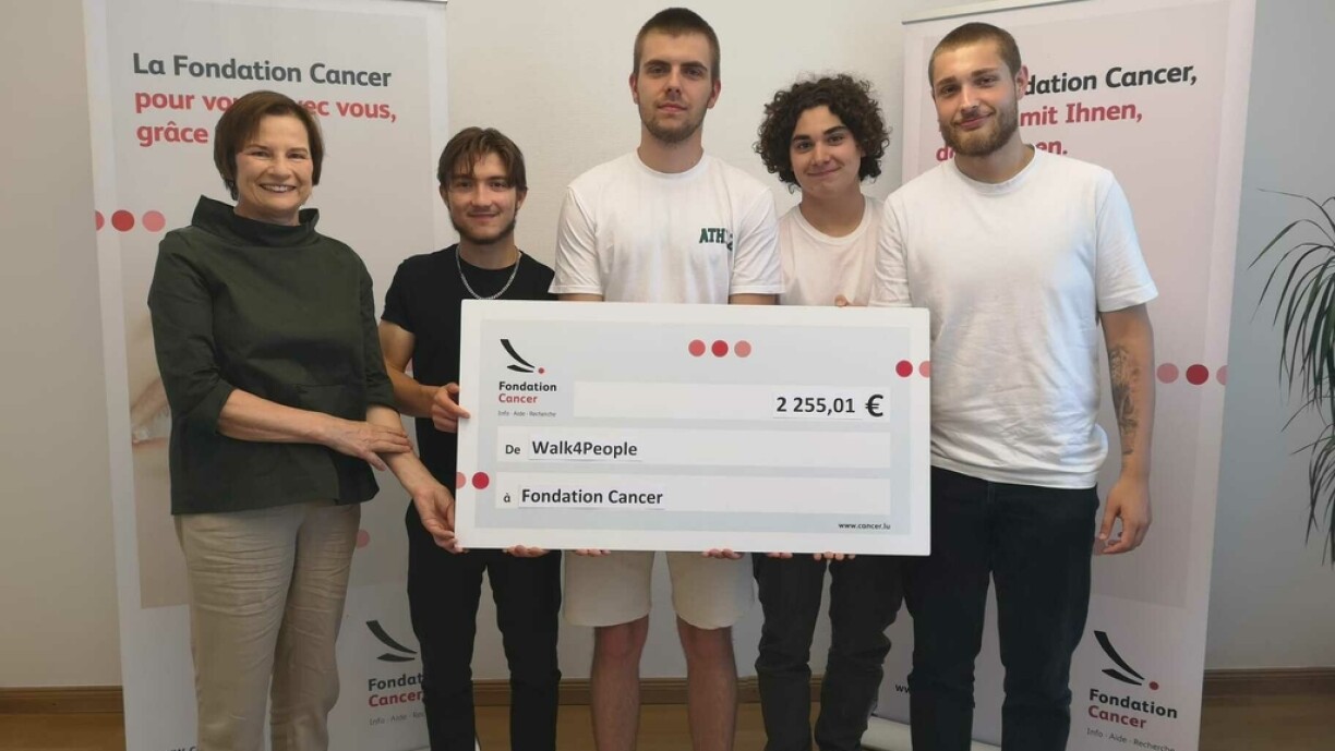 Am Kader vun dëser Aktioun konnt eng Zomm vun 2.255 € gesammelt gi an d’Grupp Walk4People huet sech decidéiert dësen Erléis der Fondation Cancer ze spenden. D’Lucienne Thommes, Direktesch vun der Fondation Cancer, huet häerzlech Merci gesot a gratuléiert fir dës super Leeschtung. Dës Initiativen erméiglechen der Fondation Cancer hir Missioune wieder ze realiséieren: Informéieren, hëllefen an d’Fuerschung ënnerstëtzen.