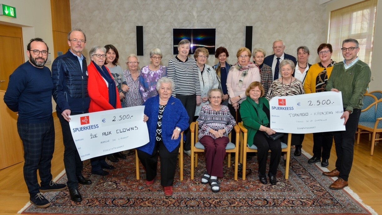 Le lundi 17 février 2020, les résidents et le personnel du Konviktsgaart ayant participé au marché de l’Avent et à l’activité « Fläisseg Hänn » ont remis des chèques de 2.500.- € aux associations « Île aux Clowns » et « Tornado – Käerjeng hëlleft ». À cette occasion, M. Marcello Loguercio, directeur du « Konviktsgaart », a remercié les résidents de leur collaboration efficace et de leur apport commun dans l’intérêt de l’organisation du marché de l’Avent et l’aide précieuse du personnel. Les fonds pour alimenter ces dons proviennent des recettes de ce marché et du tronc de la chapelle.