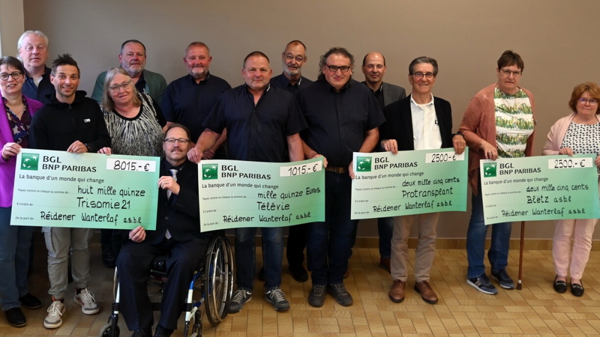 Zum Schluss vun der Versammlung war traditiounsgeméiss eng véier- Fach Scheckiwerrreechung am Gesamtwert vun ëmmerhin 14.030 Euro, déi en Deel vun de Recetten vum Wanterlaf 2023 duerstellen. E Scheck vun 8 015 Euro konnten de Claude Weber, d’Sylvia Kieffer an d‘Jeanne Zuidberg entgéint huelen, déi, der Vereenegung „Trisomie 21“ zugut kommen. E weidere Scheck vun 2 500 Euro, den fir „Protransplant“ bestëmmt ass, duefir huet de Fernand Kneip sech gefreet. D‘ Nicole Backes a Vertriedung vun der Associatioun“ Blëtz“ huet fir de Scheck vun 2 500 Euro, Merci gesoot. Weider 1 015 Euro waren am Virfeld schon fir „Télévie“ iwerwisse gin. Nodeems dat sämtlich Scheckempfänger hir Vereenegungen mat hiren respektiven Aktivitéiten a Projeten, verbonnen mat engem grousse Merci virgestallt hun, huet dess Versammlung hiren würdigen Ofschloss fond.