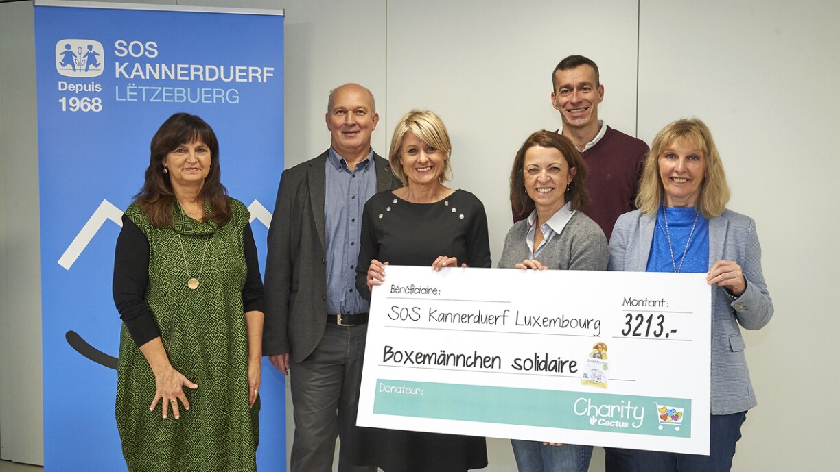 La vente du BOXEMÄNNCHEN SOLIDAIRE dans les supermarchés Cactus et les C-Shoppi a permis de faire bénéficier le village SOS Kannerduerf Lëtzebuerg d’un chèque de 3.213 €. Par l’opération Boxemännchen solidaire, Cactus s’était engagé à reverser dix cents à la Fondation Lëtzebuerger Kannerduerf et en particulier à SOS Kannerduerf Mersch qui prend en charge au quotidien des enfants et adolescents en difficulté.