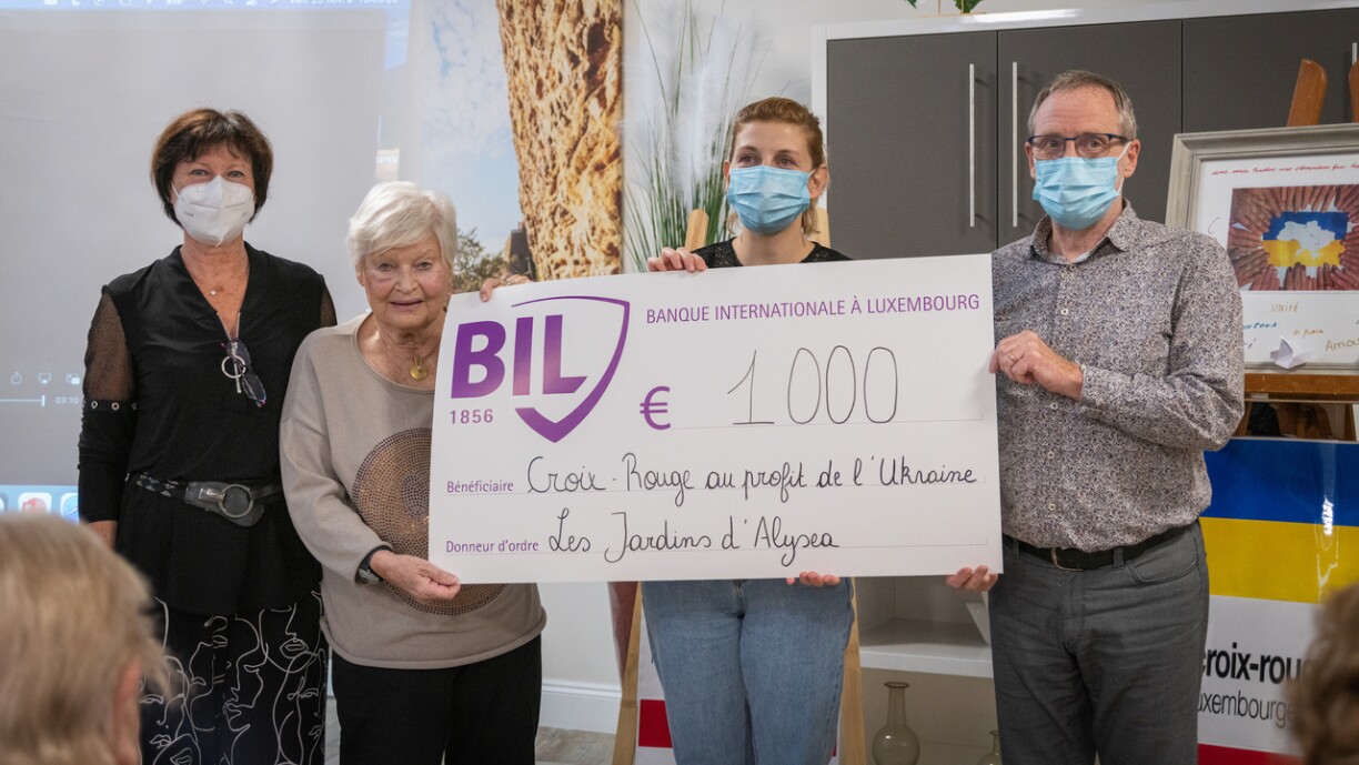 Deshalb haben die Vertreter des Jardins d’Alysea sich mit ihren Einwohnerinnen und Einwohner zusammen einenScheck in Höhe von 1.000 e an das Rote Kreuz, welches von Frau Perrotey-Torregrossa und von Herr Muller vertreten war, übergeben, um den ukrainischen Flüchtlingen weiterhin auf den Weg zu helfen. Diese Schecküberreichung fand am Freitag, den 25. November statt, während einer kleinen Zeremonie, bei der verschiedene Leute eine kleine Rede hielten, wie unter anderem eine Bewohnerin, die ihr ganzes Leben lang freiwillig beim Roten Kreuz ausgeholfen hat. Es waren auch Vertreter des Roten Kreuzes anwesend, die die humanitären Werte der Vereinigung noch einmal erläutert haben.