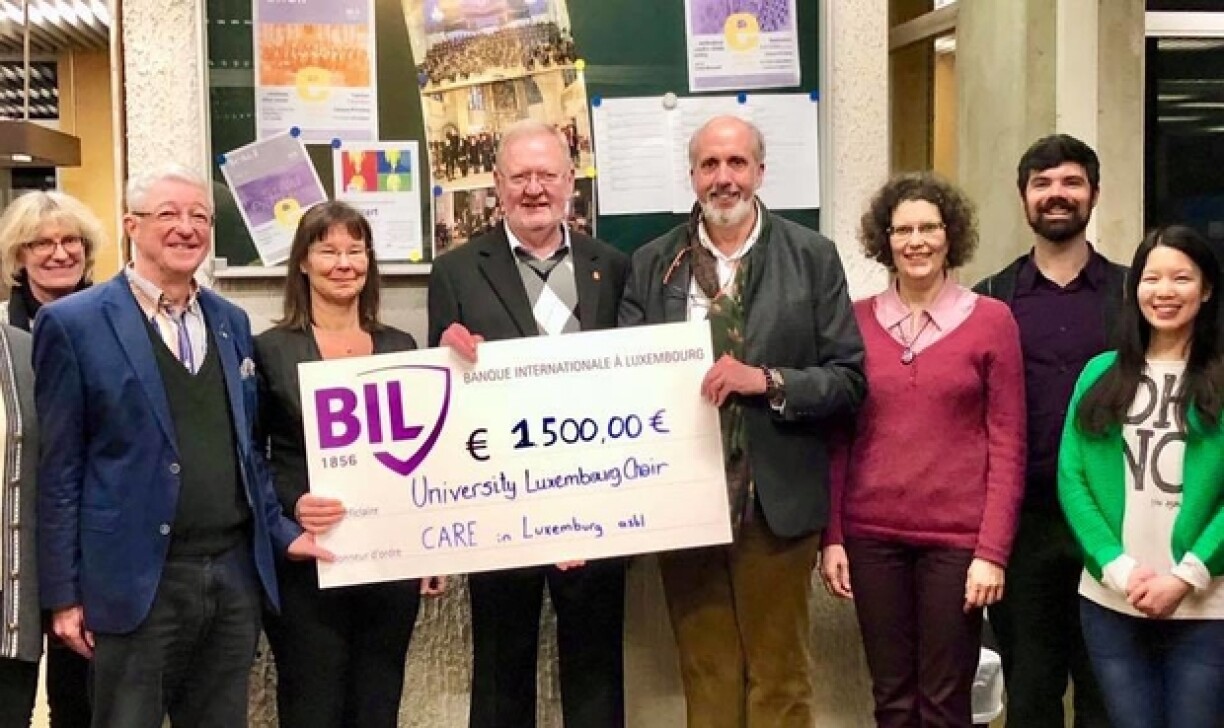 Das Benefizkonzert in der Bartringer Kirche im Beisein von Rektor Stéphane Pallage und Robert Schadeck, Präsident von Care Luxemburg, erbrachte die stolze Summe von 1.500.- €, welche dieser Tage im Beisein von François Carbon, verantwortlich für kulturelle Aktivitäten an der Uni Luxemburg, Julia Pruy und zahlreichen Chormitgliedern, sowie von den Vertretern des Musikensembles Divertimento Isabelle Merlevede und Jeannot Clement an Care Luxemburg überreicht wurde.