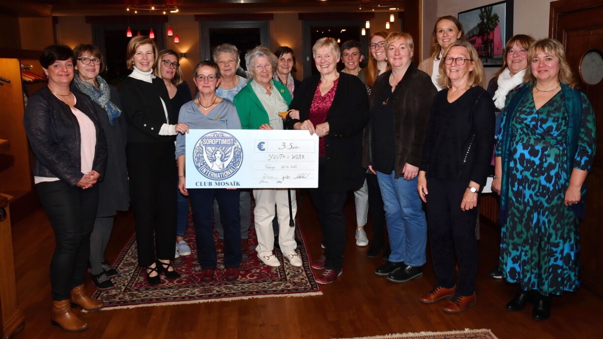 Duerch hir Aktivitéiten uechter d’Joer versichen d’Membere vum Club Soroptimist Mosaik Kanton Réiden hire Beitrag duerzou och ze leeschten. Am Kader vun enger Feierstonn am Haaptsëtz zu Sëll gouf de Scheck vun 3.500 Euro zesumme mat hirer Presidentin Rose Dax un d’Vereenegung Youth & Work iwwerginn, déi duerch d’Ariane Toepfer an d’Paule Pletgen vertruede war. No hirem grousse Merci fir de schéine Geste hu si d’Projete vu Youth & Work kuerz virgestallt, fir Jonker ze hëllefen déi an enger schwiereger Phase sinn, de Wee erëm zréck an d’Schoul oder och eng Aarbecht ze fannen.